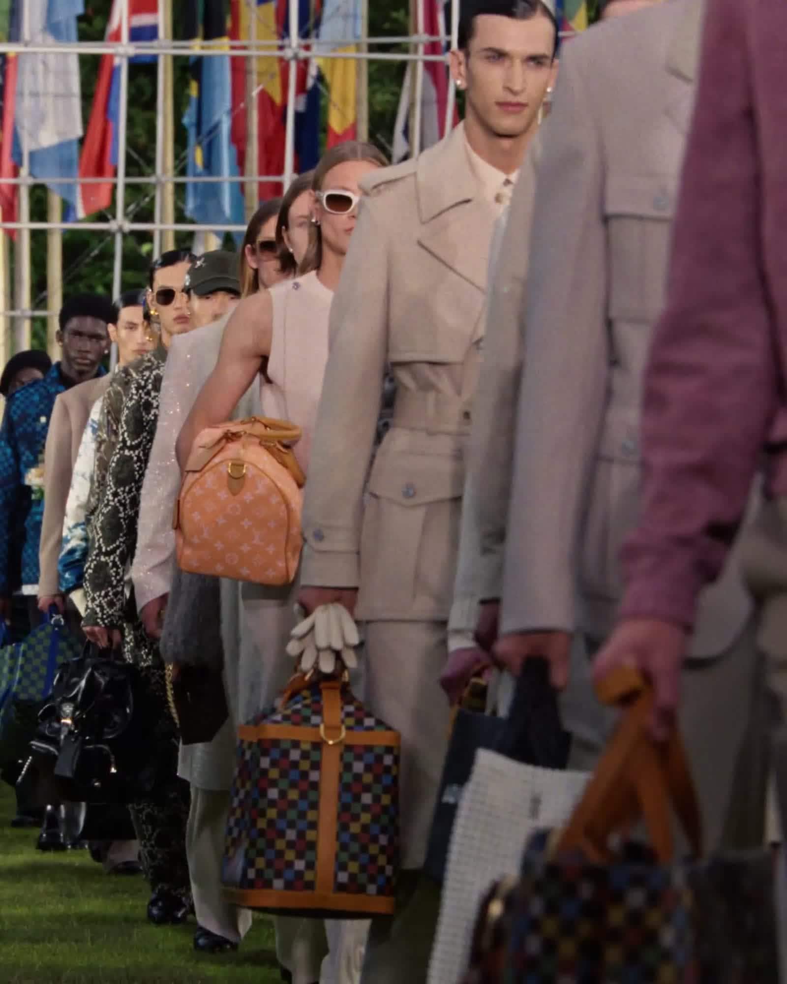 Estetika dandy ala Pharrell Williams diperkaya dengan elemen travel, merepresentasikan mentalitas global Rumah Mode lewat siluet unik. Sebuah refleksi dari keberagaman manusia, corak khas bertransformasi menjadi konfigurasi dinamis — menghiasi tas dan aksesori ikonis.