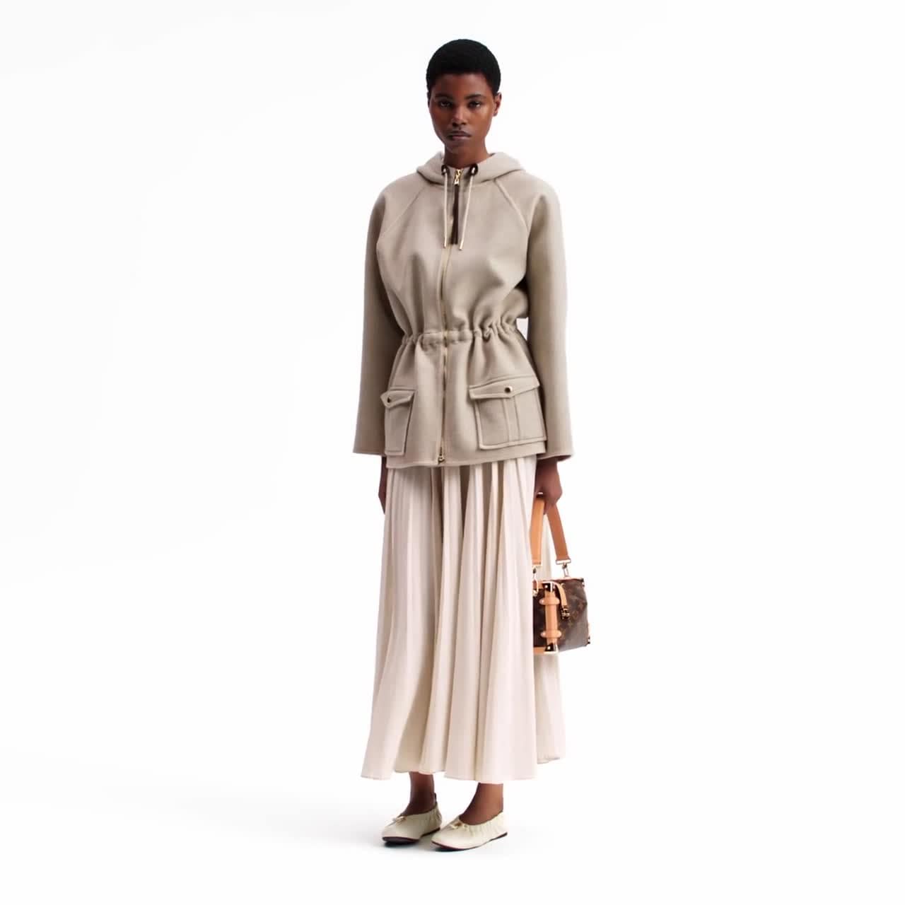 Parka beritsleting yang dibuat dari kombinasi bahan wol, cashmere, dan sutra ringan dengan teknik double face ini menambah sentuhan elegan pada gaya sehari-hari. Desainnya yang sporty dilengkapi hoodie dengan tali serut serta bagian pinggang yang dapat disesuaikan. Saku flap menyajikan kesan rapi di bagian pinggul, sementara aksen Monogram memperlihatkan nuansa khas Rumah Mode yang chic.