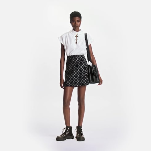 Dibuat dari bahan cotton poplin lembut yang dihiasi dengan Monogram fil coupé, Frill Blouse ini dilengkapi dengan beragam detail seperti kancing LV gold pada kerah dan hiasan bentuk Monogram Flower gold di sepanjang bagian depan. Dengan detail frill feminin pada kerah dan lengan, busana Louis Vuitton yang ikonik ini harus ada dalam lemari.