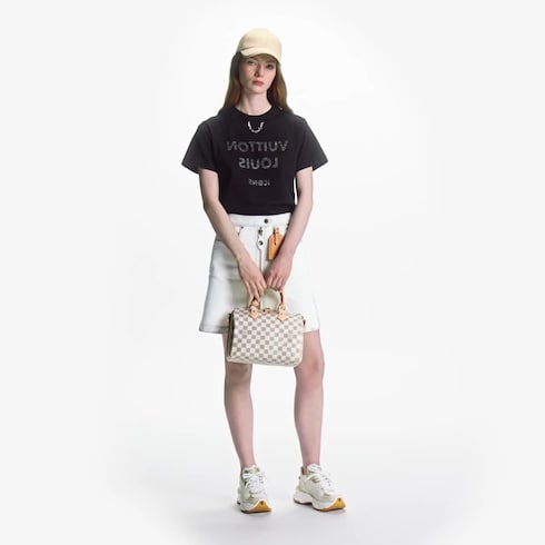 Busana ceria ini mengubah bentuk basic T-shirt dengan signature Louis Vuitton yang terbalik. Motifnya dicetak pada bahan cotton jersey fabric dengan efek coreng yang unik. Detail chain ikonik Rumah Mode menambah sentuhan akhir pada busana ini.