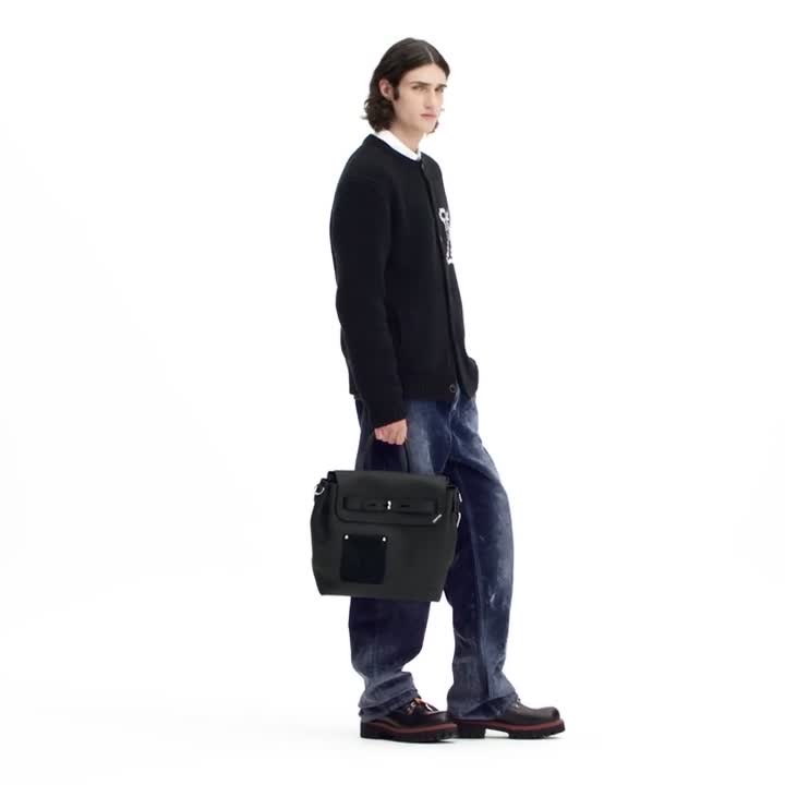 Material LV Touch calfskin leather menyajikan sisi bagian luar yang bertekstur dan bahan suede di sisi dalam. Desainnya dilengkapi satu saku depan dari material suede dengan detail jahitan V signature yang samar, serta satu klip carabiner berbentuk V yang disertai Monogram Flowers. Tali yang serbaguna memungkinkan tas ini dibawa dengan cara diselempang maupun dijinjing.
