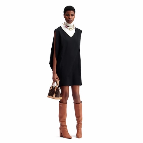 T-shirt dress ini tampil modern berhias elemen khas musim ini yang elegan. Desainnya yang berbahan cotton jersey halus hadir dalam potongan lurus dan tanpa lengan yang nyaman dikenakan, disertai lapisan asimetris yang menyajikan efek draping memikat. Sentuhan khas Rumah Mode yang chic terlihat pada bagian leher dengan detail ribbing yang dihiasi LV chain berwarna keemasan.