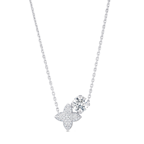 路易威登的項鍊與吊墜系列以天然鑽石搭配 18K 黃金、白金、玫瑰金、鈦金及純銀等貴金屬匠製而成,部分項鍊與吊墜更鑲嵌彩色寶石,展現高級珠寶的多樣性與奢華品質。