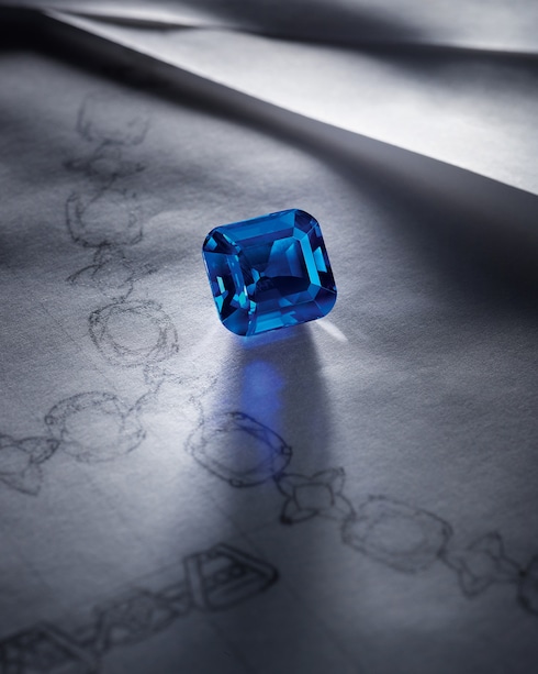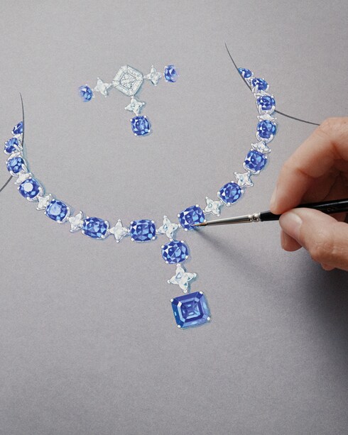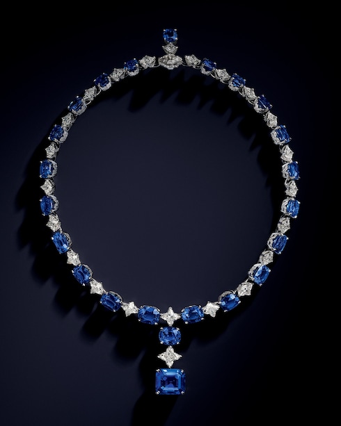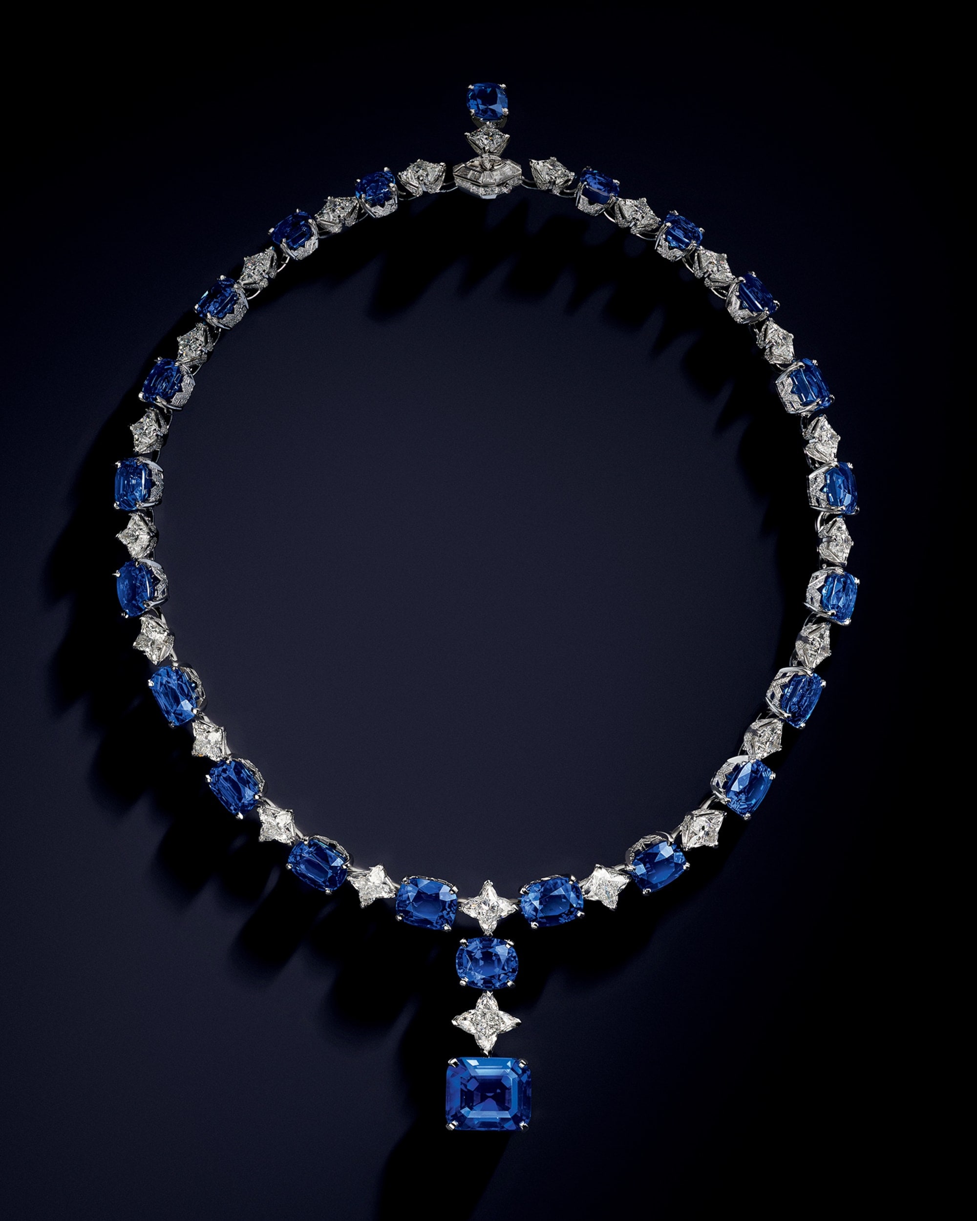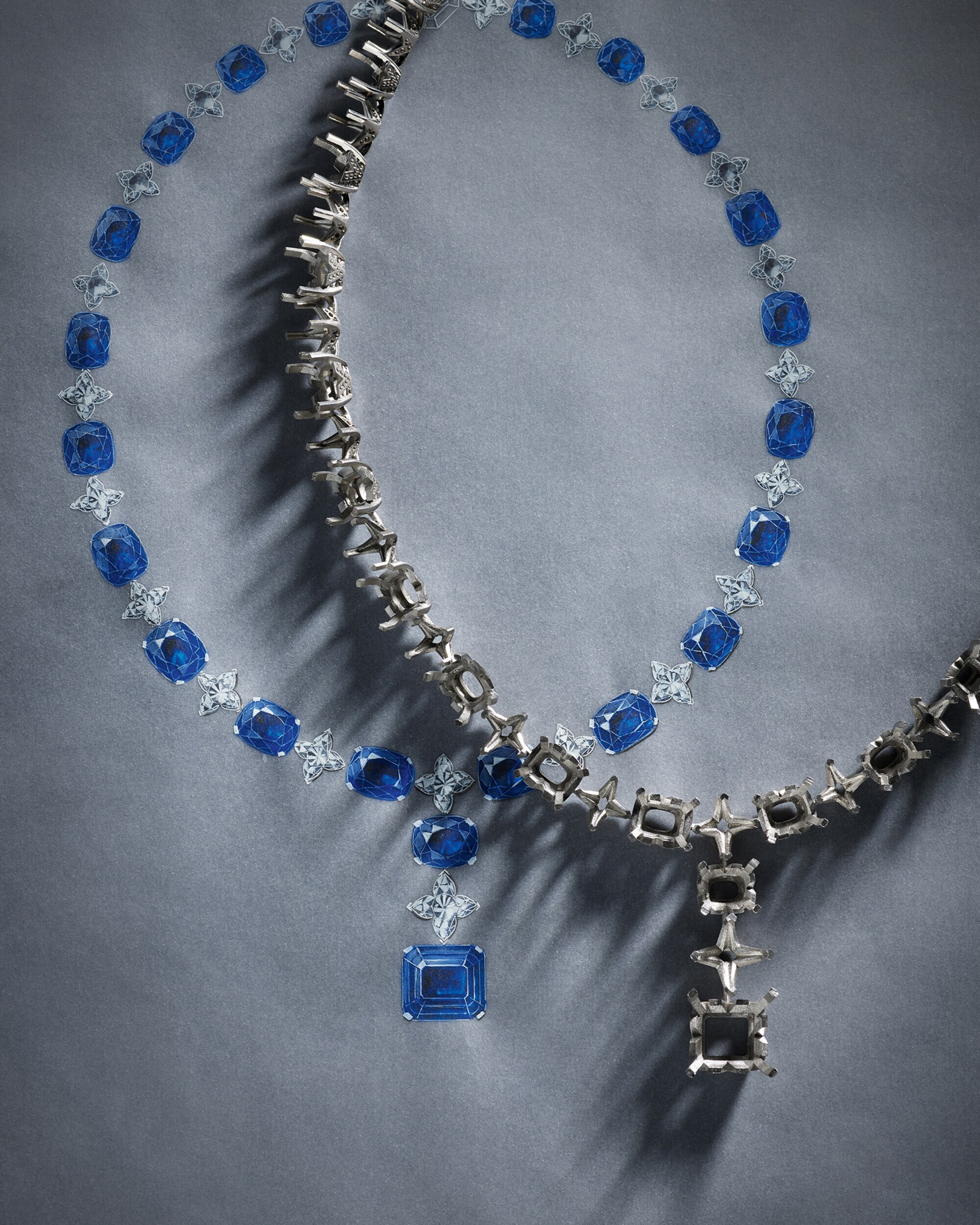 路易威登 Aster 頸鏈鑲嵌多顆稀世罕有、教人夢寐以求的喀什米爾藍寶石,呈現深邃的皇家藍色。合共 23 顆藍寶石重達 125 克拉,包括一顆份量驚人的 17.88 克拉主石,未經加工的純天然寶石散發星光般的醉人光芒。這些珍貴寶石每一顆在色澤、形狀和剔透度方面也如出一轍,成就瑰麗不凡的優雅珠寶,印證客戶在臻選寶石方面的品味慧眼和對完美的堅持。