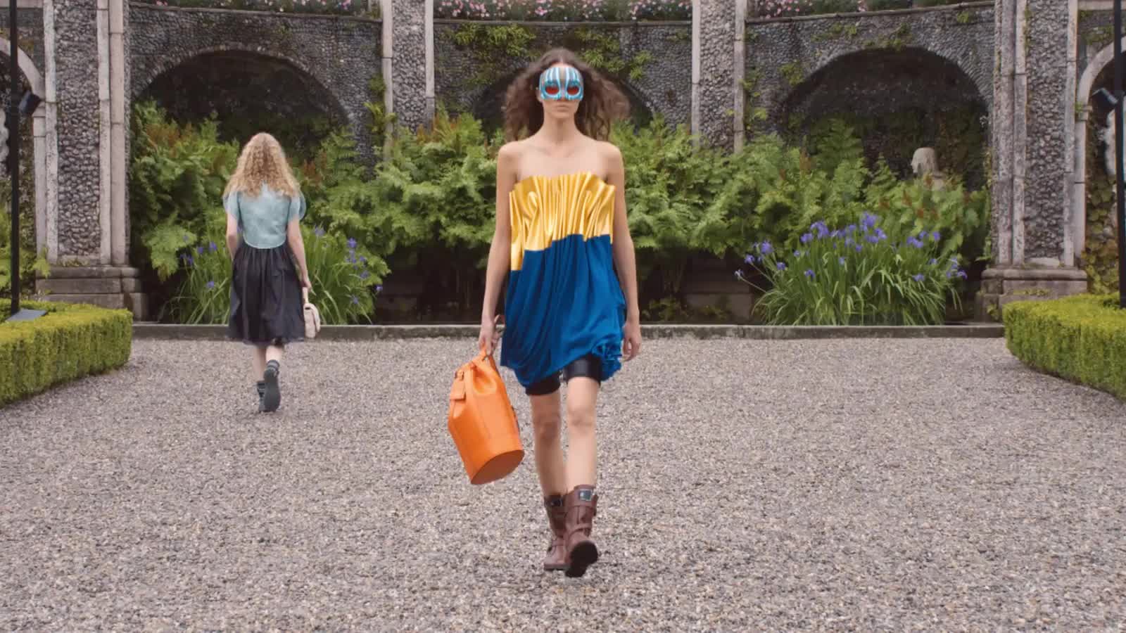 設計以真絲和閃片刺繡點綴,模仿閃亮的鱗片和水流的動態,刻劃由海洋世界走進植物國度的旅程。在陸地上,印花琳琅滿目,線條變得更立體,而手袋更披上全新 Monogram Dune 或色彩絢麗的Epi皮革,訴說一個關於後現代的故事。