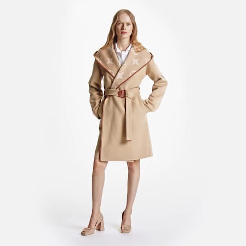 這款溫暖舒適的連帽裹式大衣採用雙面技術羊毛純絲混紡面料製作,是路易威登的經典主打款式。大衣內側飾有巨型Monogram標誌圖案,腰間配以本季的標誌性腰帶,突顯優雅柔美氣息。衣袖綴以皮革貼飾,為造型添上品牌格調。