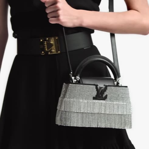 這款精緻的Capucines East-West Mini包包源自2025春夏時裝秀的Exceptionals LV Sparkle系列,是晚宴場合的理想之選。閃耀的手工切割水晶鏈逐一縫製於小牛皮袋身,LV Initials標誌向品牌經典傳統致敬。袋蓋可內置或外露,配上可拆式肩帶更締造出時尚百搭造型。