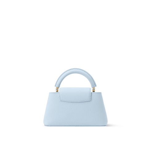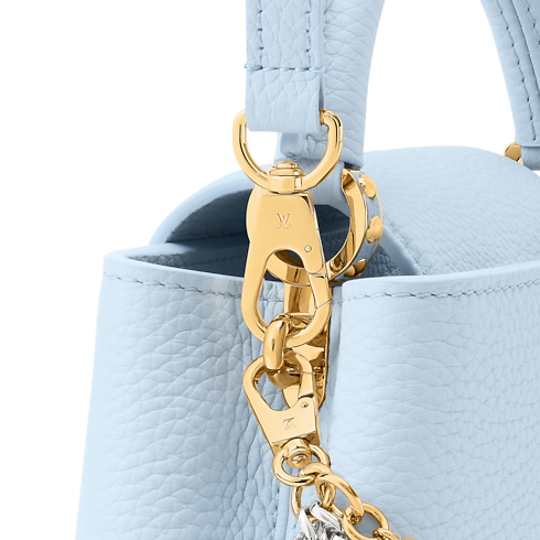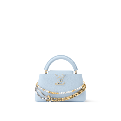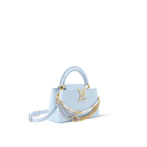 Why Knot系列重新演繹Capucines EW Mini,配上Bleu Olympe色調,同時展現雋永與時尚的魅力。修長的廓形採用Taurillon皮革製造,並結合金色及銀色金屬件,注入現代氣息。如點綴Monogram吊飾的鏈條,靈感源自高級珠寶,還飾有精緻的珍珠細節。包包可作兩種攜帶方式,並設有多個內置口袋。