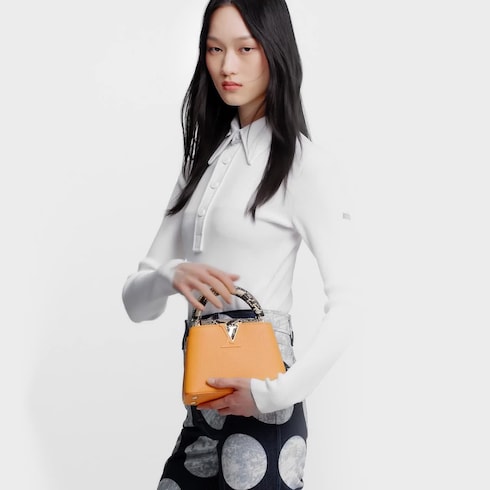 這款引人注目的Capucines Mini包包綴有鮮亮的金黃色Taurillon皮革,完美配襯天然蟒蛇皮袋蓋及手柄。迷人的包包能以頂端手柄手提,或以時尚的寬肩帶斜背,日夜場合皆宜。