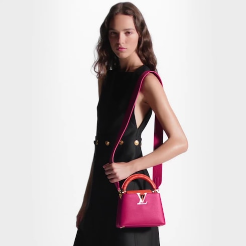 這款Capucines Mini包包以鮮明的Fuchsia色調Taurillon皮革製作,搭配亮橙色鴕鳥皮的袋蓋及頂端手柄。包包配有可拆式寬肩帶,可作肩背舒適攜帶。袋蓋可內置以展露LV標誌,亦可外露以突顯Monogram花卉圖案。