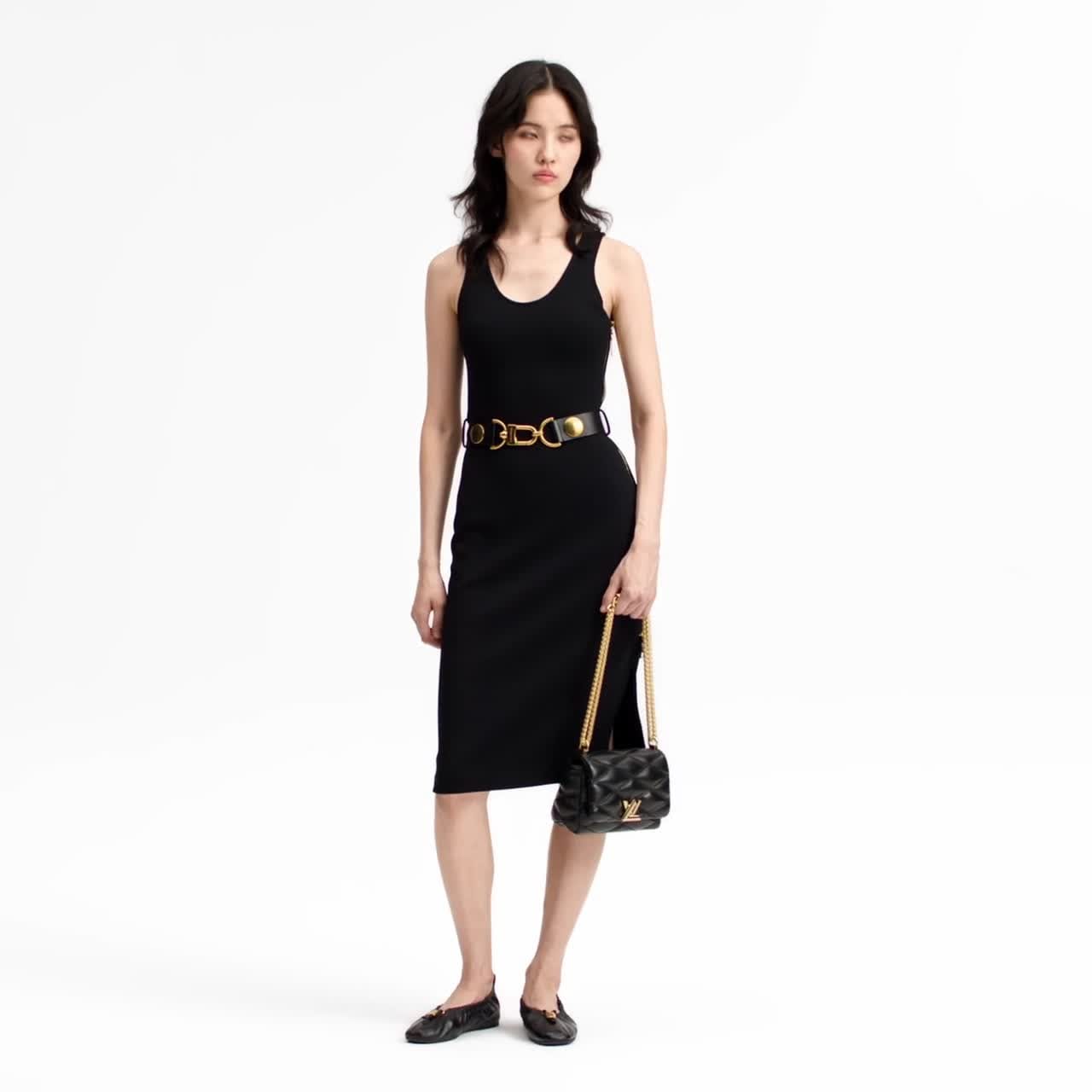 這款低調素雅的連身裙綴有別具個性的細節,展現時尚前衛風格。別緻的背心造型及膝裙身選用輕盈的Viscose混紡縐綢針織布縫製,配有皮革寬腰帶,以金色飾釘和大型登山扣點綴,現代感十足。