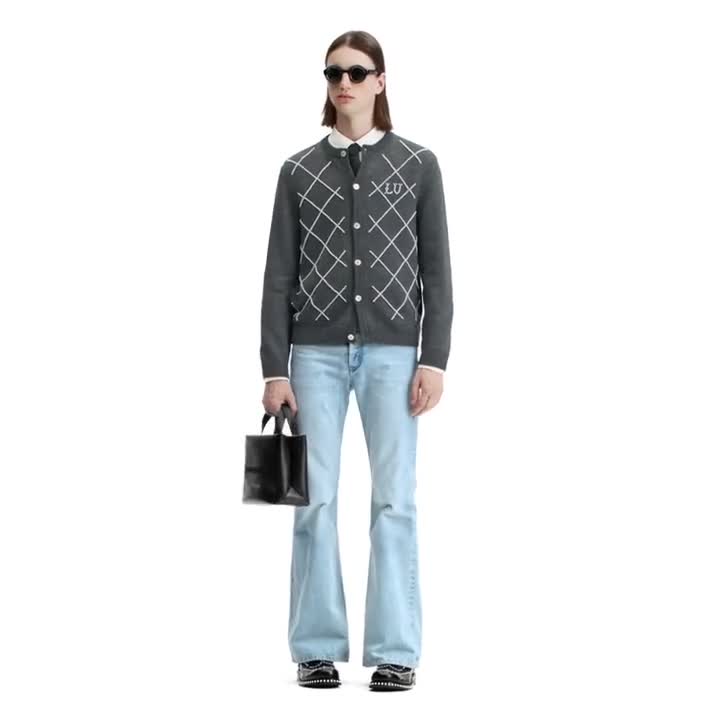 這款深灰色開襟外套以負責任採購的美麗諾羊毛製成,專為本系列以英國貴族鄉間宅邸為靈感的節慶家庭聚會主題而設計。正面飾有以珠光寶氣的白色珠飾刺繡的Damier Argyle圖案,而襟前還綴有LV標誌。外套可搭配俐落的純棉襯衫,締造高雅而從容的晚宴造型。