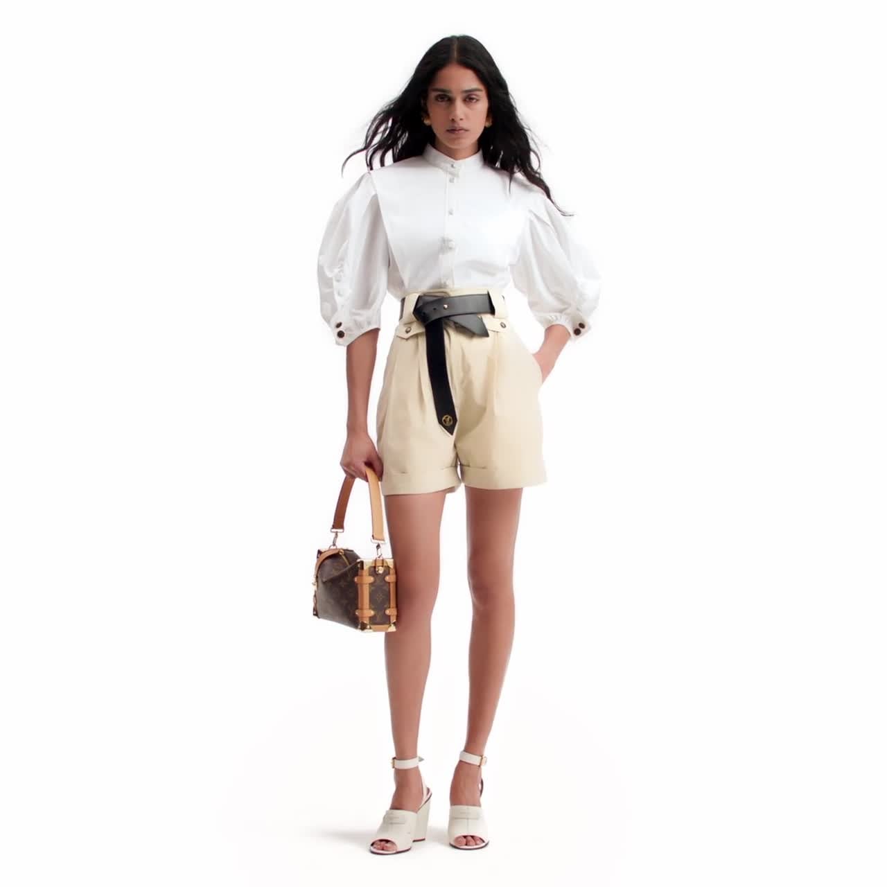 這款短褲以柔軟的桃毛絨效果棉質布料呈現雋永色調,配以精緻優雅的金屬鈕扣,締造充滿夏日氣息的時尚設計。短褲採用輕盈的闊腿廓形剪裁,配以粗高褲腰打造修身版型。摺腳設計及兩個飾以褶襉的迷你翻蓋口袋增添正裝風格,令造型至臻完美。