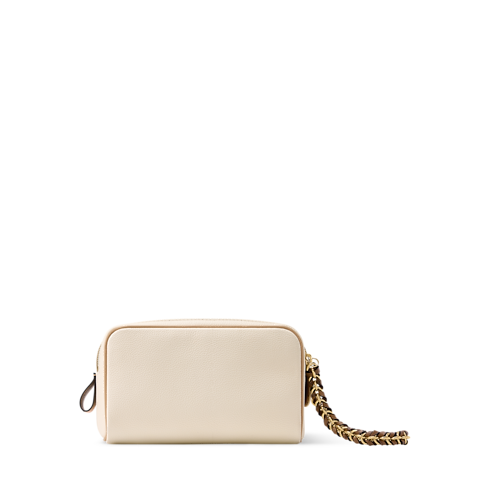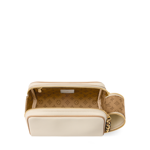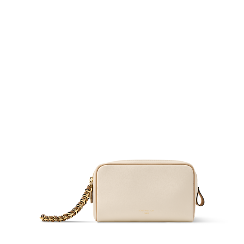 創意總監Nicolas Ghesquière為Mini Dopp Kit注入嫵媚的優雅氣息,設計選用Vanilla色小牛皮精心製作,並以金色編織鏈條點綴。雙拉鍊寬闊開口方便存取配有Monogram圖案內襯的的內部間格及拉鍊口袋,而鏈條更可將此實用包款化身為時尚手提配飾,展現高雅格調。