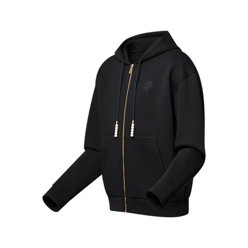 這款拉鏈連帽上衣以精緻細節締造百搭休閒造型,最適合旅遊時穿著。抽繩調節扣的裝飾珍珠珠子令人聯想起時尚考究的系列靈感,而襟位則綴有Marque L. Vuitton Déposée刺繡標誌。上衣可搭配同系列的套裝慢跑褲,締造完整的休閒拉鏈造型。