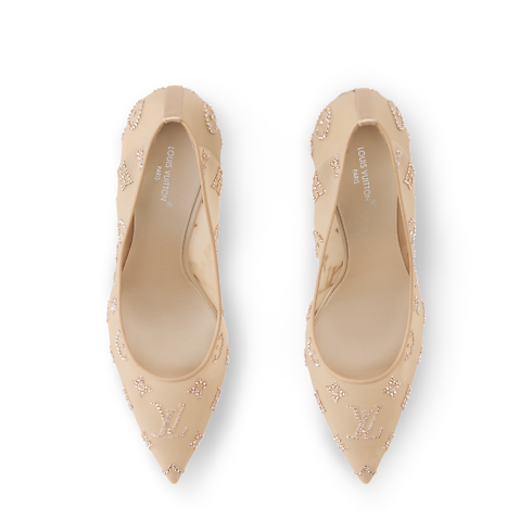 這款Gala高跟鞋今季以網布重新演繹,並以萊茵石刺繡勾勒Louis Vuitton Monogram圖案。皮革鞋底以LV Initials金色金屬件低調點綴,搭配尖頭和細高跟設計,締造精緻的晚宴風格鞋履。