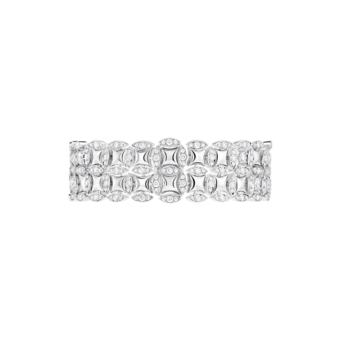 Galaxie系列以奪目而柔美的珠寶向Monogram花卉圖案致敬,演繹路易威登超越不同風格與時代的永恆經典。這款雙排手鍊具有輪廓分明的建築感設計,運用精湛超卓的工藝締造柔軟的網紋效果,以18K白金的亮麗光澤與鑽石的璀璨華彩交織成奪目效果。此別具匠心的非凡珠寶日夜場合皆宜,能跨越時光洗鍊,依然保持優雅真韻。