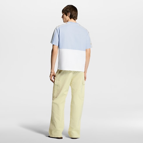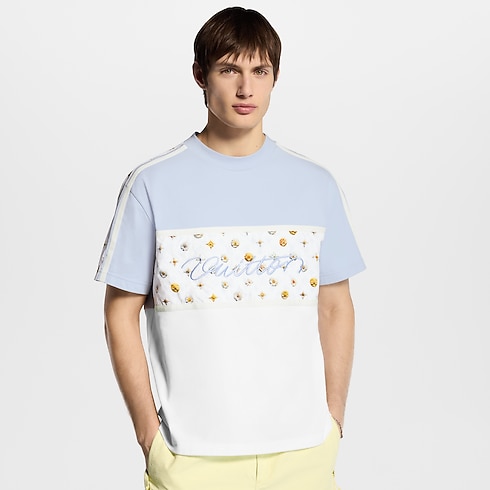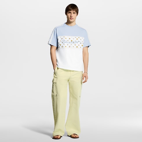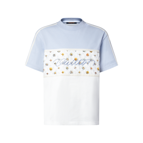這款淡藍與白色的拼色有機棉質T恤綴以玩味十足的春日花卉圖案,襟前及衣袖的運動風拼接均飾有Blooming Monogram圖案,並以亮麗絲線於正面繡上Vuitton草寫體標誌。T恤能輕鬆搭配本系列的淺色調單品,為休閒造型增添亮眼的幾何風元素。
