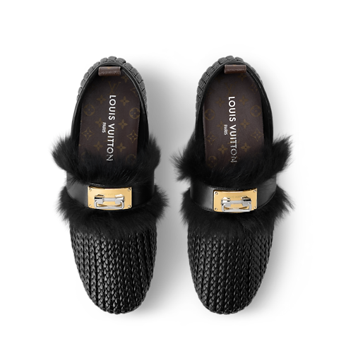 這款Haven密頭平底涼鞋以編織小牛皮製造,綴以毛絨的羊毛皮飾邊,由女裝藝術總監 Nicolas Ghesquière為2026年春夏系列時裝展精心設計。鞋款融合舒適的穿著體驗,在柔軟的網布上展現精湛的皮革編織工藝。涼鞋綴有金色的Swing鎖扣,向品牌經典硬箱致敬。