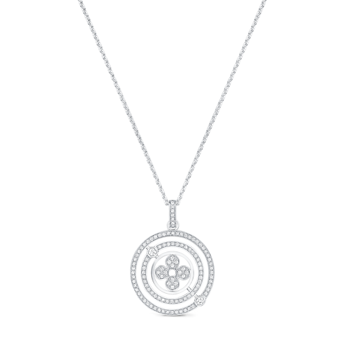 這款充滿現代風格的圓牌源自Idylle Blossom系列,向Monogram花卉圖案致敬,以18K白金製作,鑲嵌閃爍密鑲鑲石,搭配可調節長度鏈帶,締造多變造型。設計別具雅緻玩味,可獨立配戴或與Idylle Blossom系列其他款式疊戴搭配。