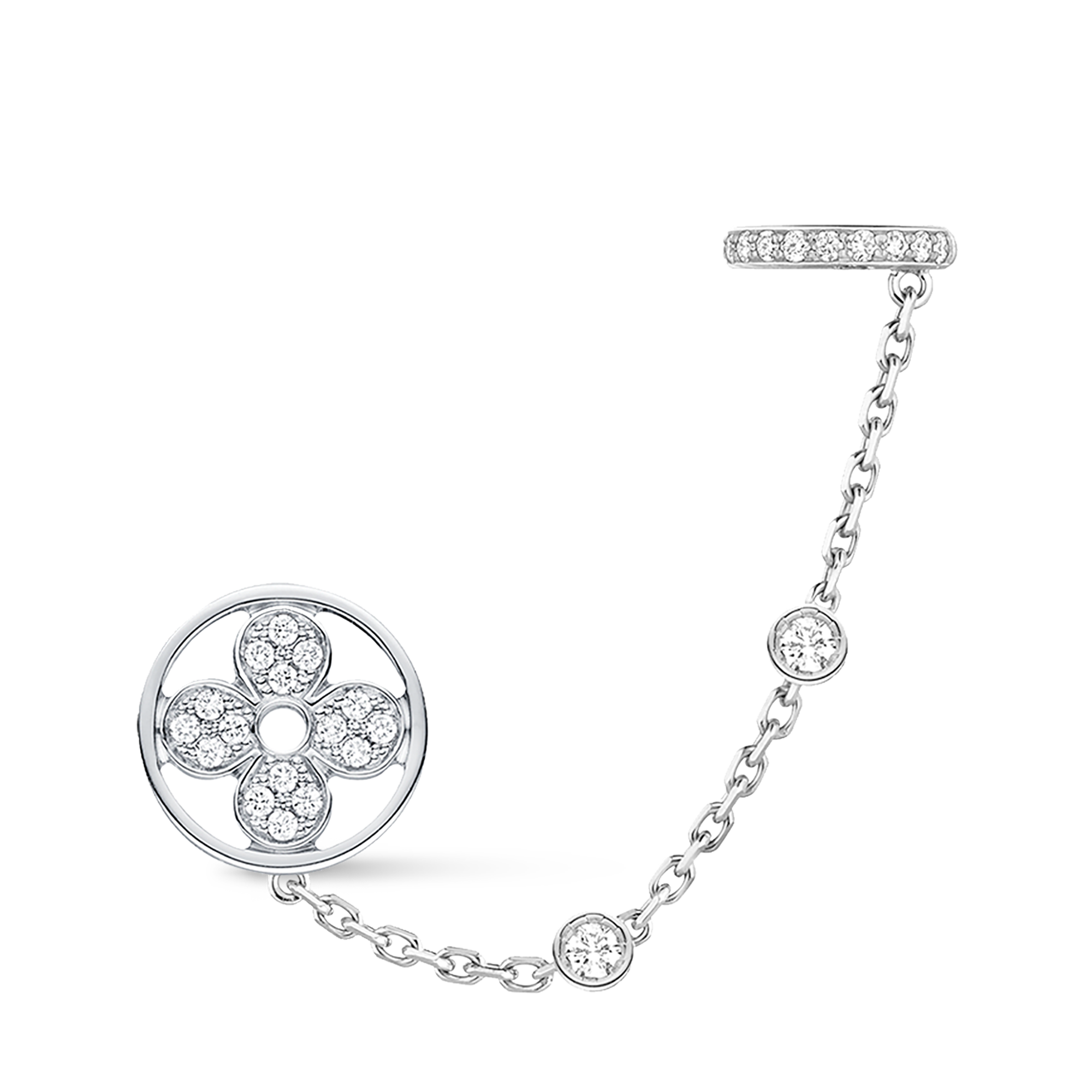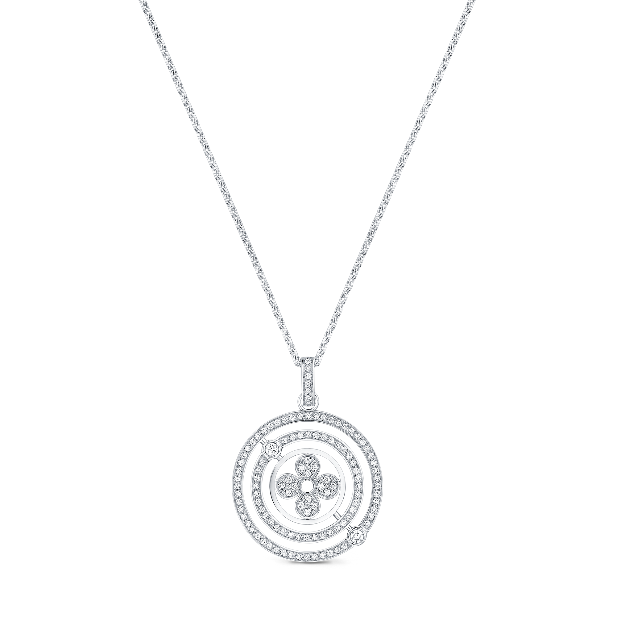 這款Idylle Blossom吊墜以18K白金製作,頌讚Idylle Blossom系列誕生十周年。吊墜上的Monogram花卉圖案鑲有鑽石,設計充滿玩味,洋溢柔美氣息,可與同系列首飾完美搭配。