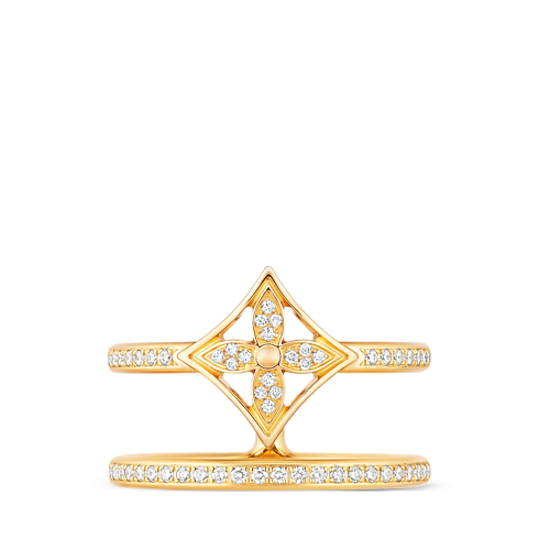這款戒指源自Idylle Blossom系列的珠寶鑽飾,以18K黃金精心打造,鑲滿明亮璀燦的鑽石。Monogram花卉圖案綴於上排戒指,仿似疊戴了一對戒指,締造時尚造型。這款飾物可與系列的其他珠寶首飾混搭,塑造個人風格。