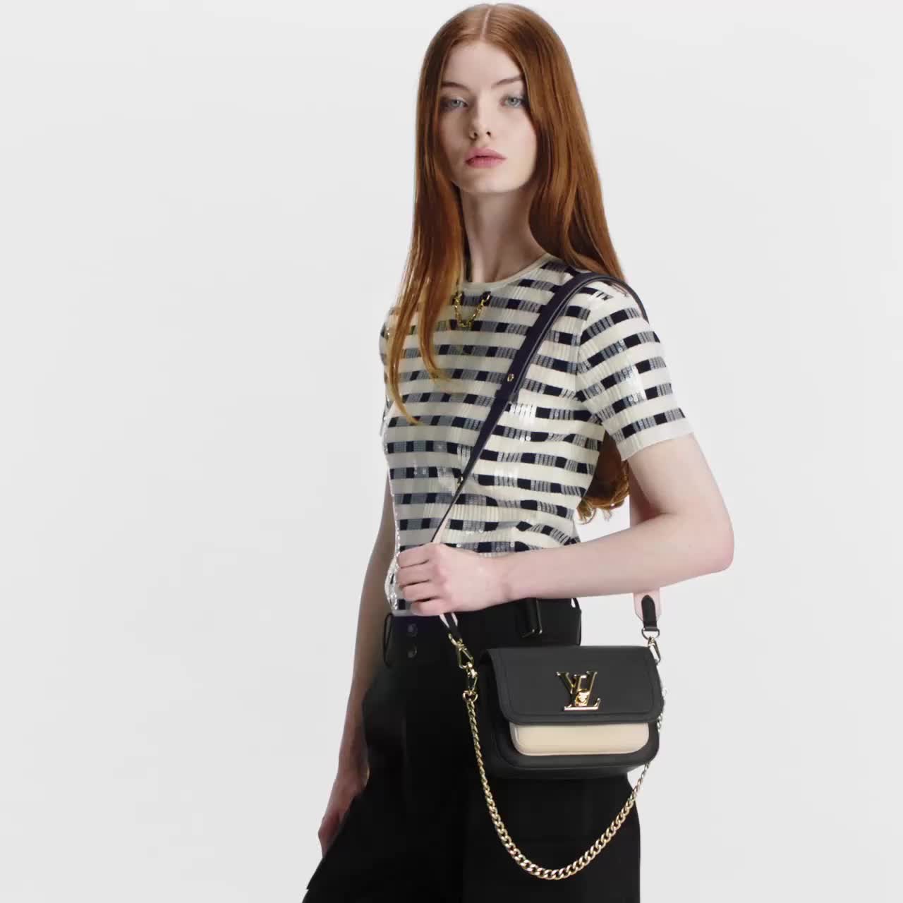 這款Lockme Tender斜後背包採用柔軟粒面小牛皮製成,除了傳統金色鏈帶外,更配有可拆式和可調節長短的寬肩帶。百搭肩帶的兩面都綴以不同顏色和質感,並飾有金屬D型圈環,可配以不同吊飾打造個人風格。