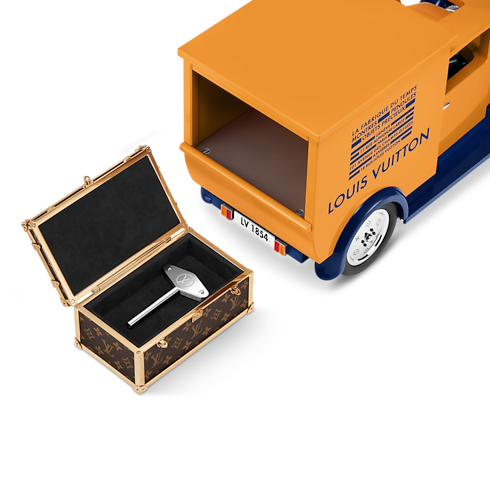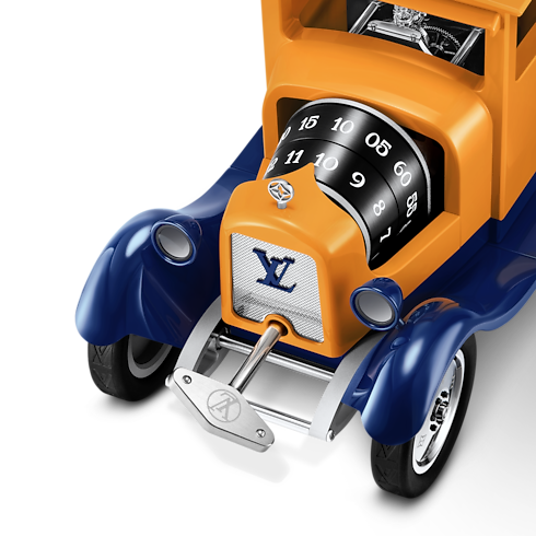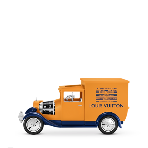Louis Vuitton Camionnette桌上時鐘完美體現品牌對卓越服務與精湛工藝的不懈追求。 這款傑作以路易威登歷史悠久的貨車為靈感,設計綴以品牌傳承中的標誌性地址,完美體現旅遊藝術的精髓 這款限量版精品透過設計與精密技術,重新定義收藏級鐘錶的精要元素。 貨車以路易威登標誌性的Saffron色為主調,並於正面配備兩枚旋轉錶盤,精確顯示時間,同時展現出機械引擎的美學。 背面巧妙融合了一個實用的迷你Monogram圖案硬箱,並隱藏了時鐘的上鍊匙。