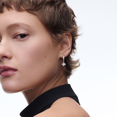 這款LV Diamonds密鑲環狀耳環精緻展現品牌卓越的珠寶工藝。耳環以18K白金精心鑄造,中央鑲嵌LV Monogram Star切割鑽石,並耳環更飾有圓形明亮式切割鑽石。中央主石的鑲座靈感源自Louis Vuitton傳奇Monogram圖案的經典花卉設計,設計靈動又易於配襯,是值得珍藏一生的難忘禮物。