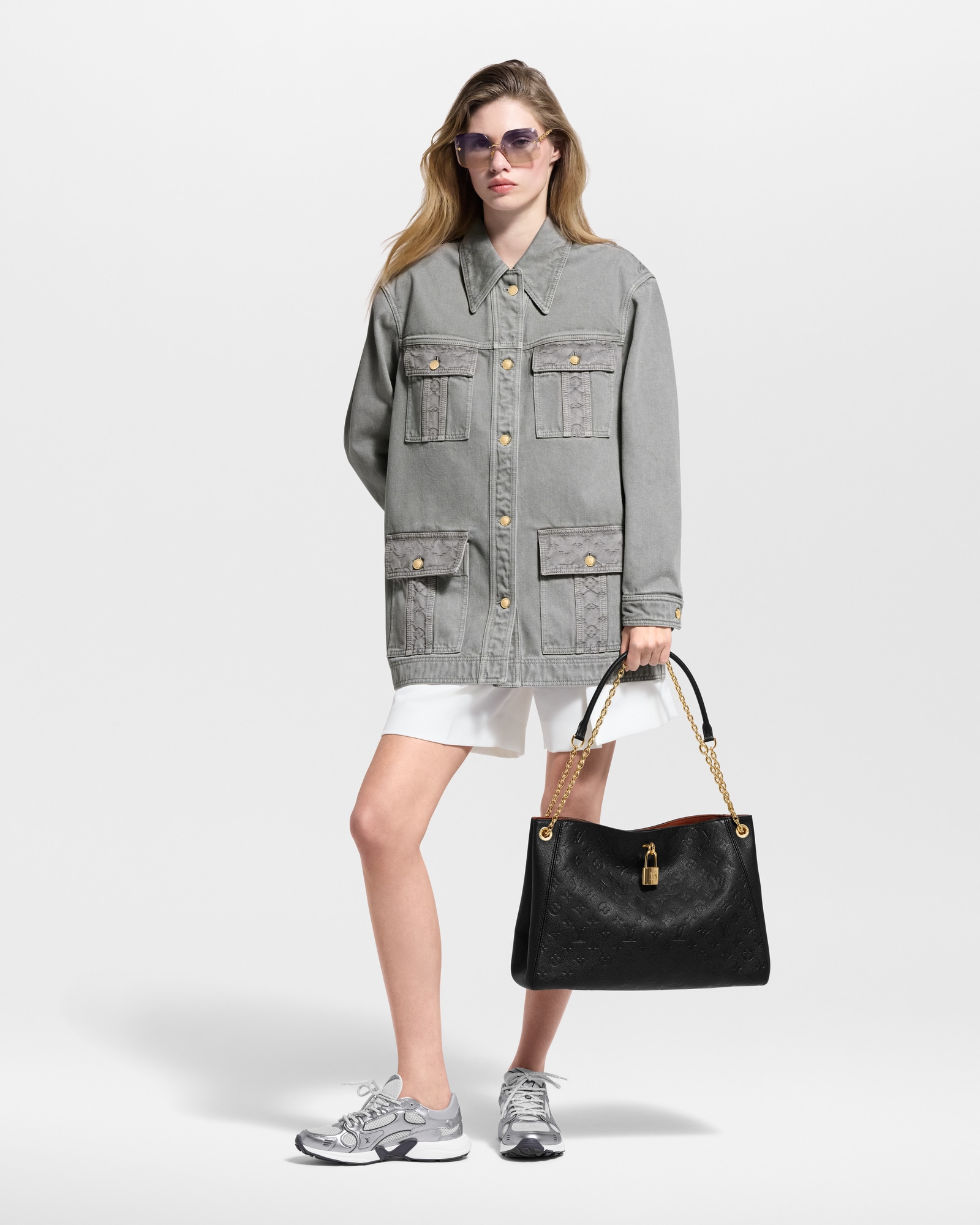 這款LV Jewel Square太陽眼鏡於今季採用特大方形設計,造型鮮明出眾,無框設計搭配多邊切割鏡片,效果天衣無縫。鏡臂配備纖巧的標誌性鏈帶,並綴有品牌標誌,包括LV Initials標誌和Monogram花卉圖案。