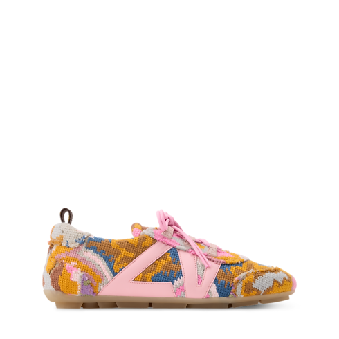 這款LV Sneakerina芭蕾風運動鞋於2026年春夏系列時裝展上登場,以花氈面料製造全新版本,靈感源自東方地毯與十九世紀法式刺繡工藝。復古造型的花卉圖案再現品牌的Monogram花卉圖案,鞋側以小牛皮點綴LV標誌,配上柔軟的橡膠鞋底。