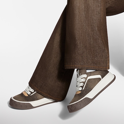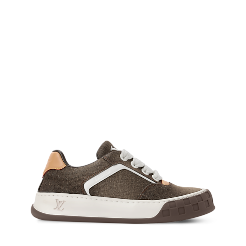 這款LV Tilted運動鞋以專為時裝系列而設計的「Coffee Bean」色調牛仔布演繹。這款高級牛仔布料並非染色,而是以編織工藝營造出褪色古舊效果,突顯運動鞋靈感源自千禧年代早期的復古格調,並飾以天然皮革飾邊及傾斜的LV Initials標誌。