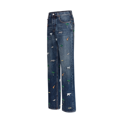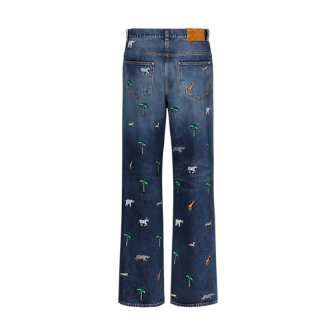 這款幾何風滑板牛仔長褲綴以2026春夏系列時裝展主打的LV x The Darjeeling Limited圖案,滿佈生動絢麗的棕櫚樹與動物刺繡圖案。褲上還飾以標誌性細節,包括背面右側褲袋上的L.V.M.標誌刺繡及Mini Damier磨砂皮革標籤。長褲可搭配同系列的套裝襯衫,締造完整的套裝造型。