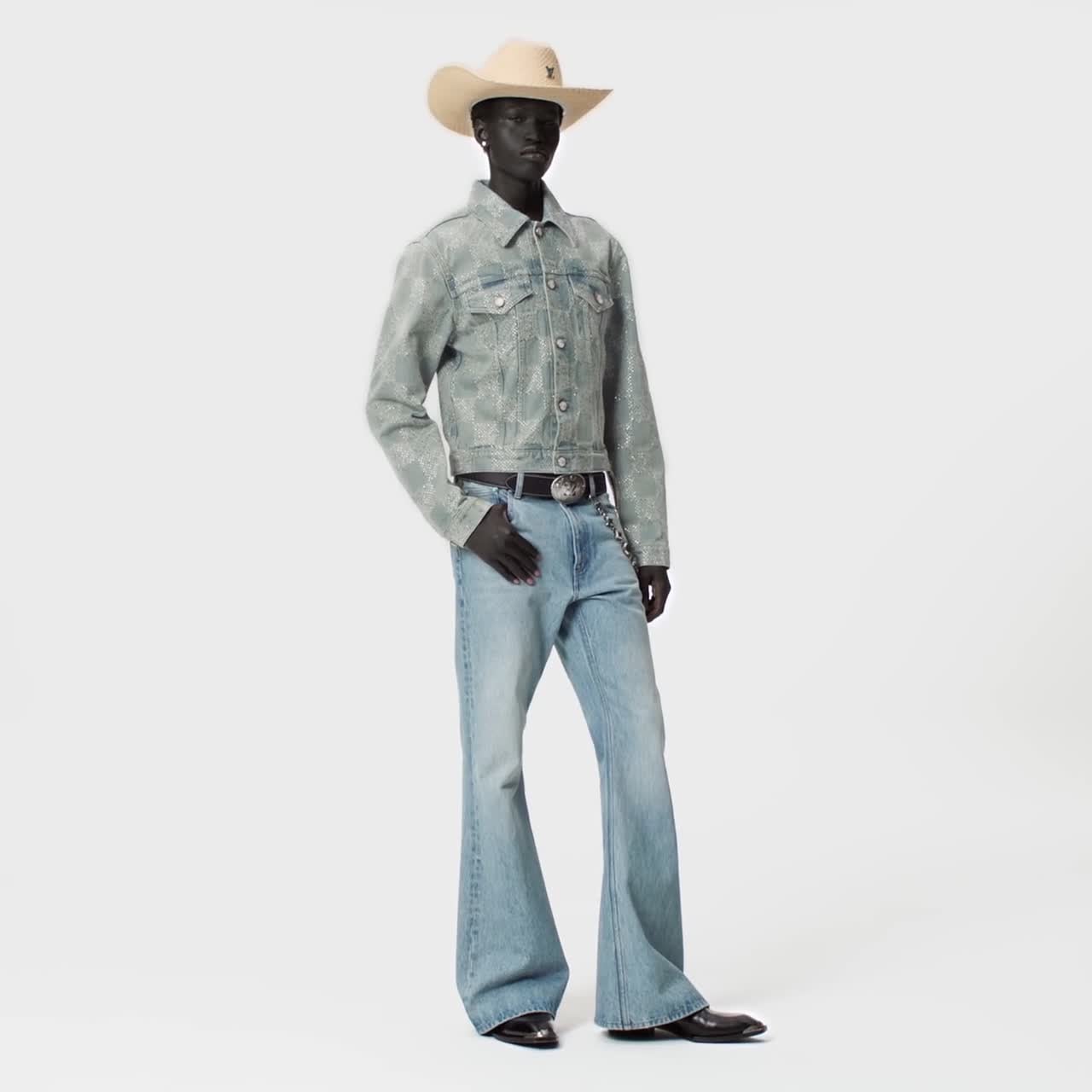 這款定製的Damier牛仔外套以閃爍造型演繹2024秋冬時裝展時尚考究的西部風格。經典廓形採用水洗Damier提花面料製作,精心綴滿手工水晶,搭配「Marque L.Vuitton déposée」標誌及珍珠飾面鈕扣,為引人注目的設計更添精緻氣息。