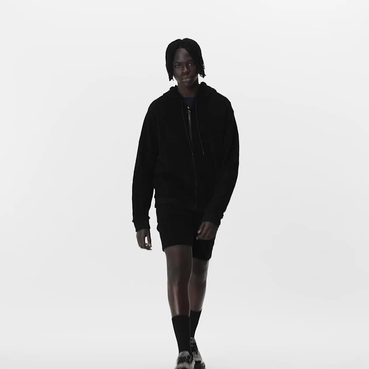 這款柔軟的毛圈布短褲是海灘之旅後穿著的休閒款式,設計精緻且易於穿著,配備可調節鬆緊的束繩褲腰。黑色棉質混紡料綴滿同色調的Monogram壓花圖案,造型鮮明出眾,可完美配搭相襯的連帽衫。