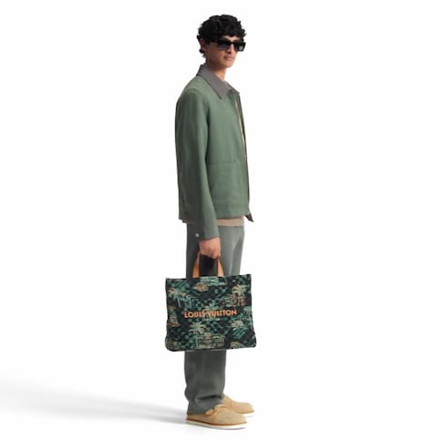 這款Shopper Tote以提花棉布裁製,圖案靈感源自復古風格的邁阿密明信片,捕捉這座城市熱情奔放的夜生活風貌。Marina藍色的背景上飾以棕櫚樹、建築地標及復古汽車等多個邁阿密的標誌元素。Pharrell Williams特別選用的經典「Marque déposée L.Vuitton」標誌巧妙隱藏於華麗的圖案之中。