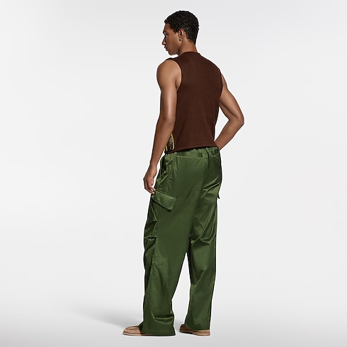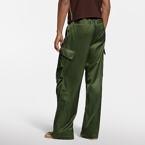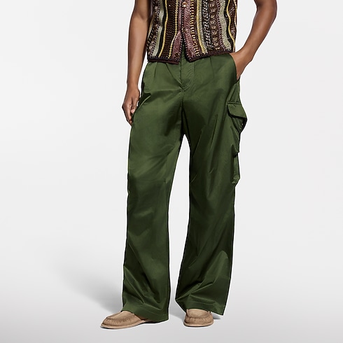 這款綠色工裝風長褲採用充滿光澤的絲棉混紡面料精心打造,為經典實用的廓形注入奢華格調。褲款寬鬆流暢,正面以褶襉設計,後腰則配以舒適鬆緊帶,展現自在優雅。後袋上方綴有Louis Vuitton Paris 刺繡標誌,細節盡顯品牌匠心,休閒造型日夜皆宜,完美演繹本季輕鬆高雅的時尚風範。