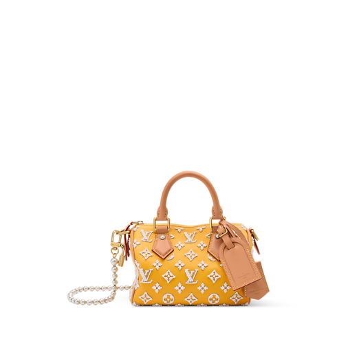 這款超迷你Speedy P9 Bandoulière 20以柔軟小牛皮製作,配以珍珠光澤的Monogram,盡顯優雅格調。包包採用設有兩個皮革頂端手柄的經典廓形,配上可拆式珍珠鏈條,為設計注入 Pharrell Williams 的時尚考究美學。內裡選用小羊皮襯裡及標誌性 P9 飾牌,細節精緻不凡。