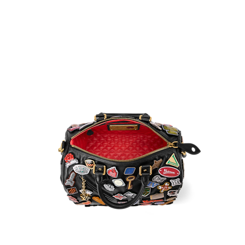 這款Speedy P9 Bandoulière 30選用蠟面牛皮製作,令人想起復古皮革外套。設計綴有超過70枚人手固定的皮革別針,以硬底設計與仿金屬立體效果增添獨一無二的個性格調,配襯紅色絎縫小羊皮襯裡,令包款洋溢搖滾氣息。