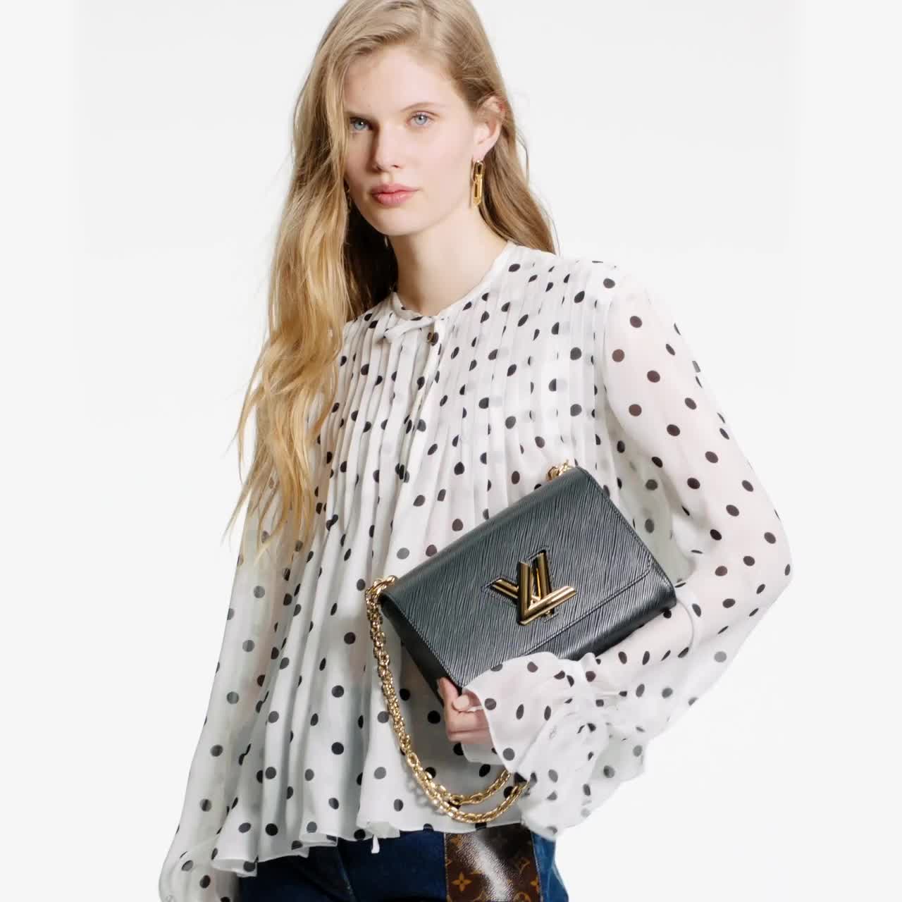 這款Twist MM鏈帶包款以品牌經典的Epi皮革製造,採用全新的標誌性LV Twist轉鎖,以閃亮的金色金屬點綴立體標誌。手工精美的包款底部採用巧妙的「波浪型」設計,令容量格外寬敞,日夜場合攜帶皆宜。滑動式鏈帶肩帶可重疊作肩背攜帶,亦可延長作斜背攜帶。這款Twist包款於2015年早春系列中首度登場,是品牌的全新經典之作。