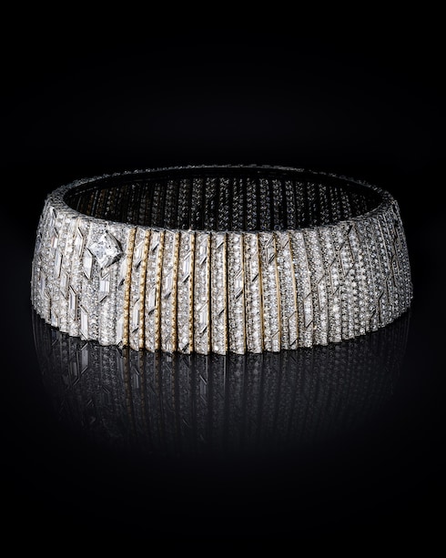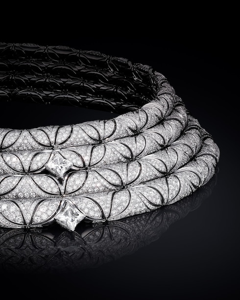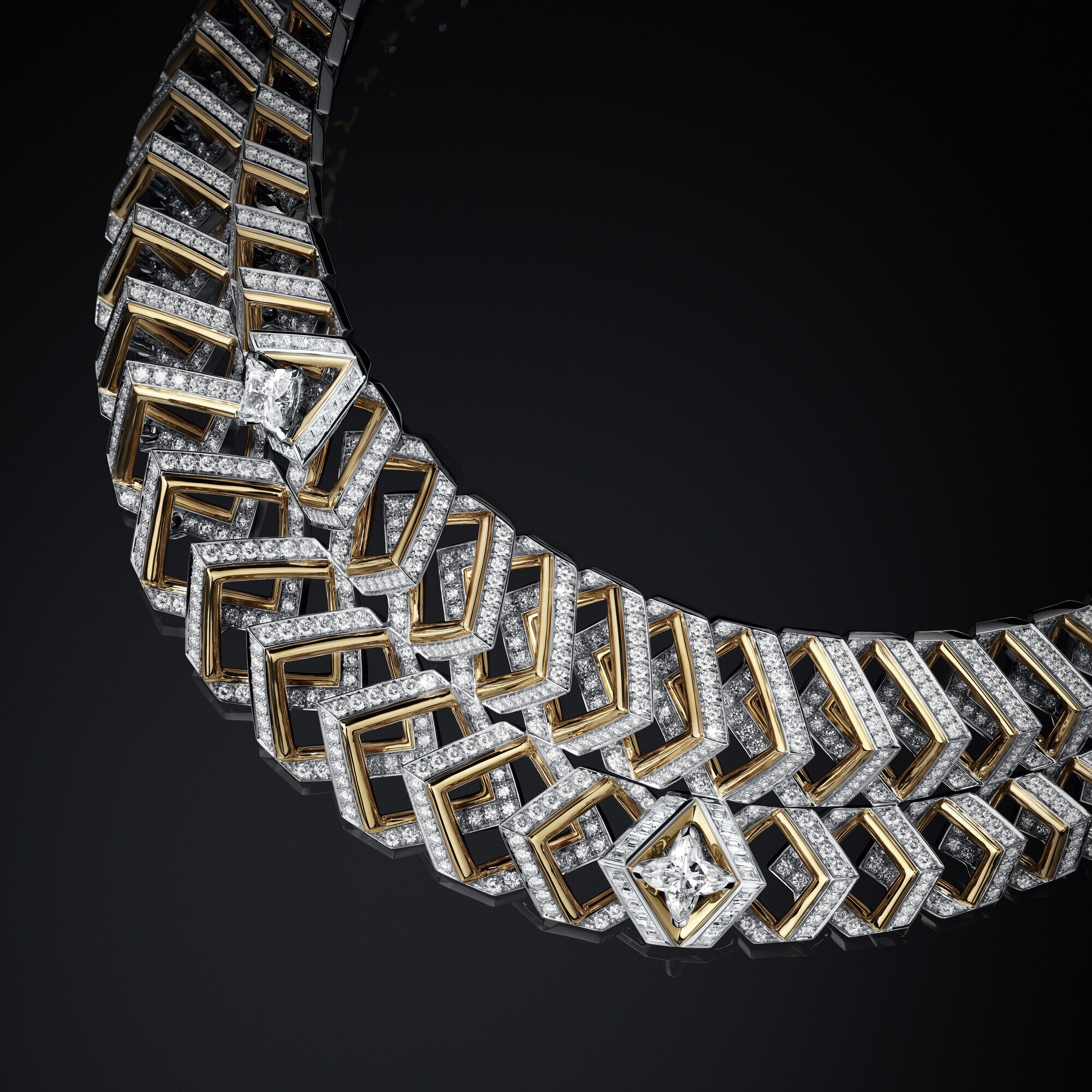 Dynamisme 珠寶呼應 19 世紀的現代收藏主義,令人想起驅使路易威登屹立創新前沿的旅行熱潮。結構立體的項鏈以精準排列的鏈節和 LV Monogram Star 切割鑽石組成,形成緊密相連的奪目效果。兩排立體人字紋圖案彰顯無出其右的精湛工藝,而鉑金和黃金的配搭亦令稜角分明的線條更加鮮明。