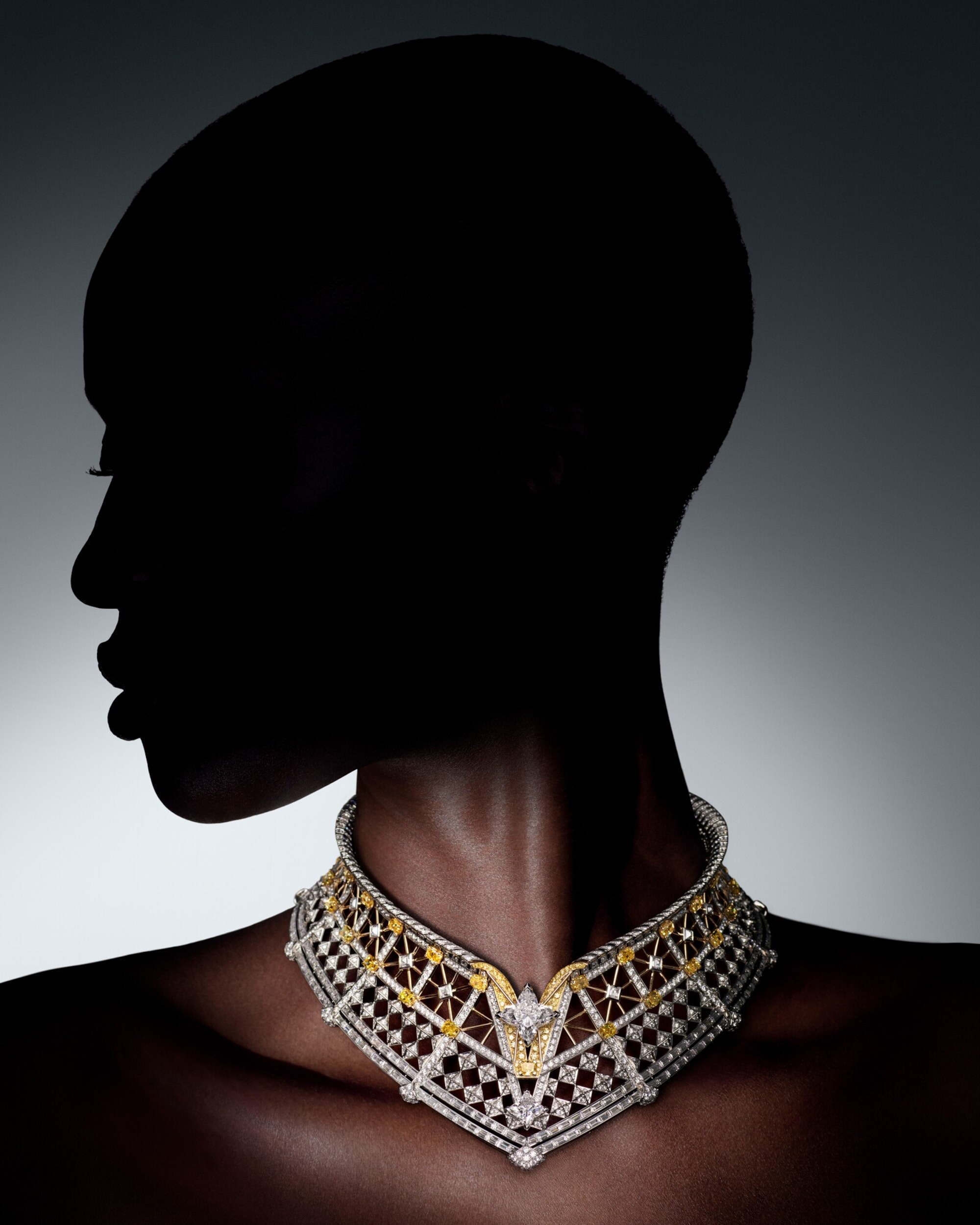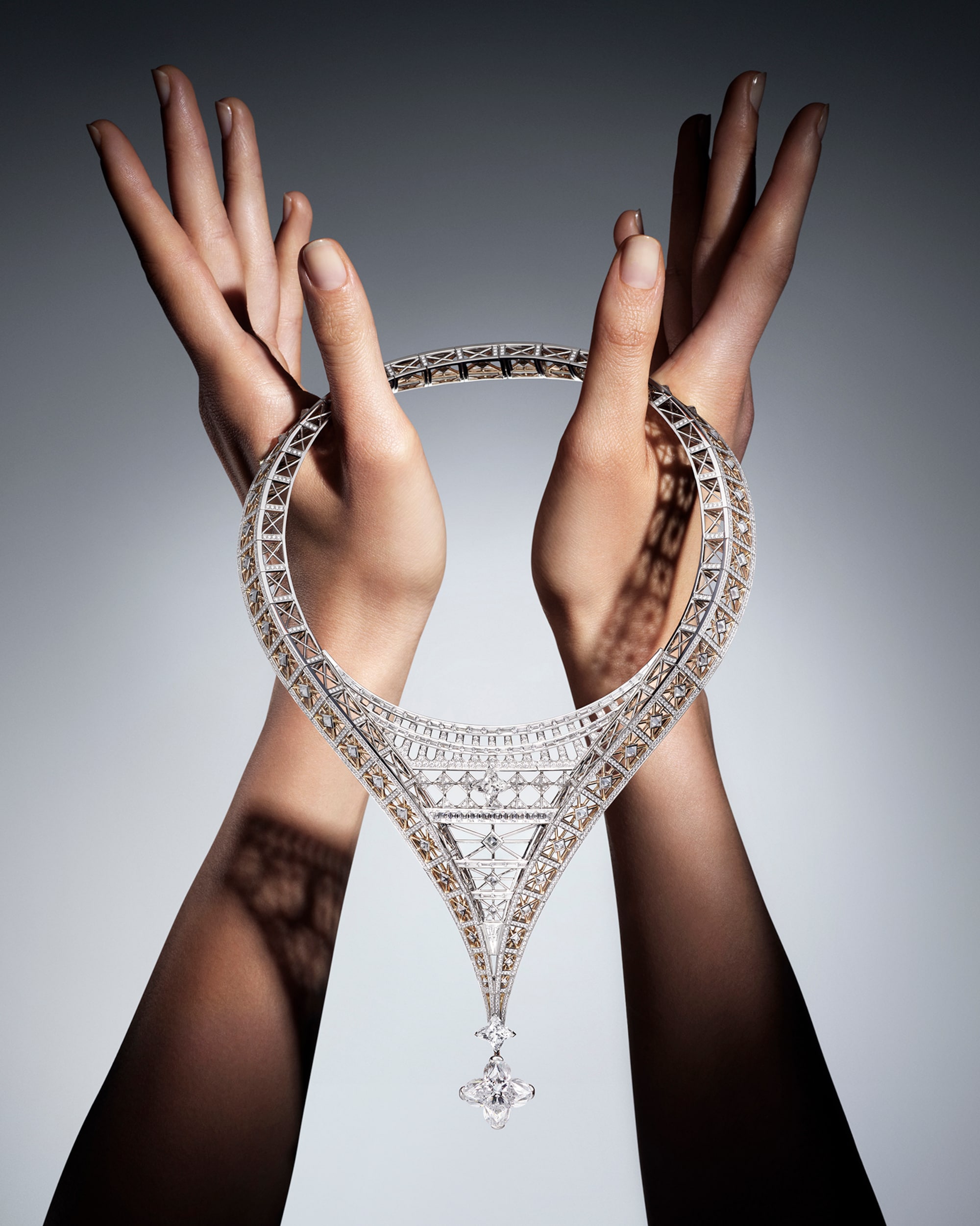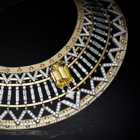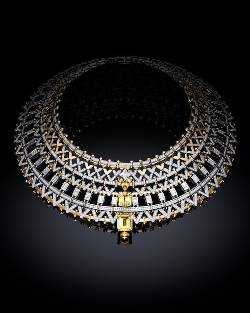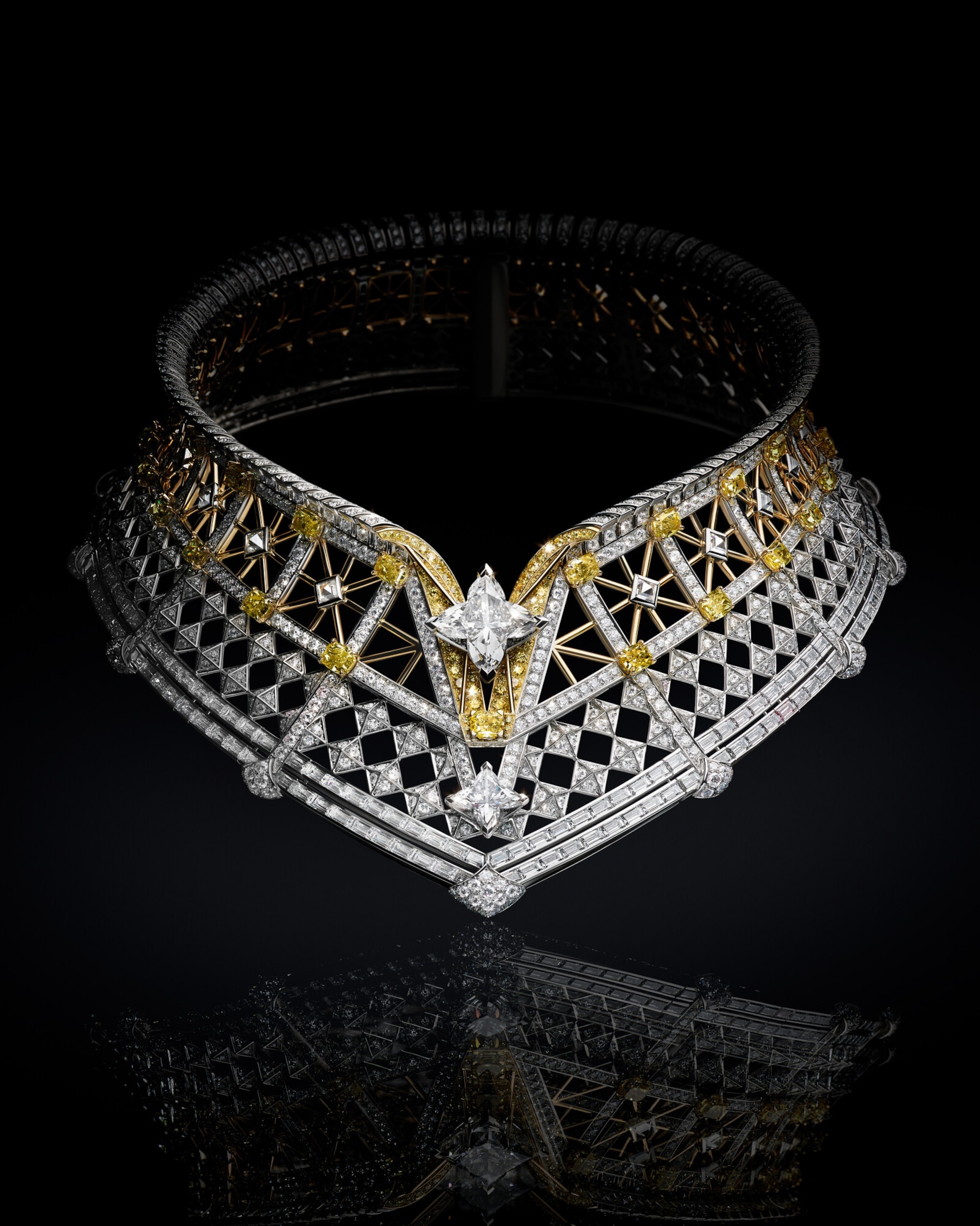 Victoire 系列體現巴黎的精湛手製工藝,以令人驚豔的珠寶傑作向工藝與建築傳統致敬。層次分明的項鏈鑲嵌 25 顆珍罕黃鑽,大膽變奏路易威登的經典V形輪廓,多層式的璀璨設計亦體現傳統工藝與現代優雅美學。