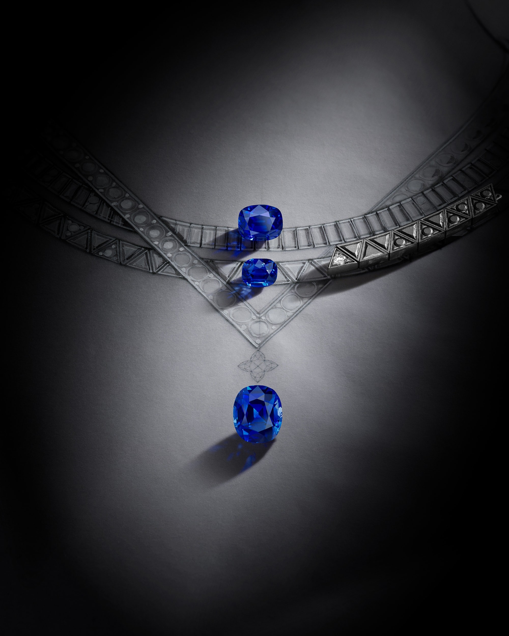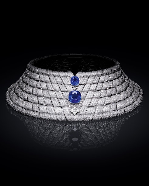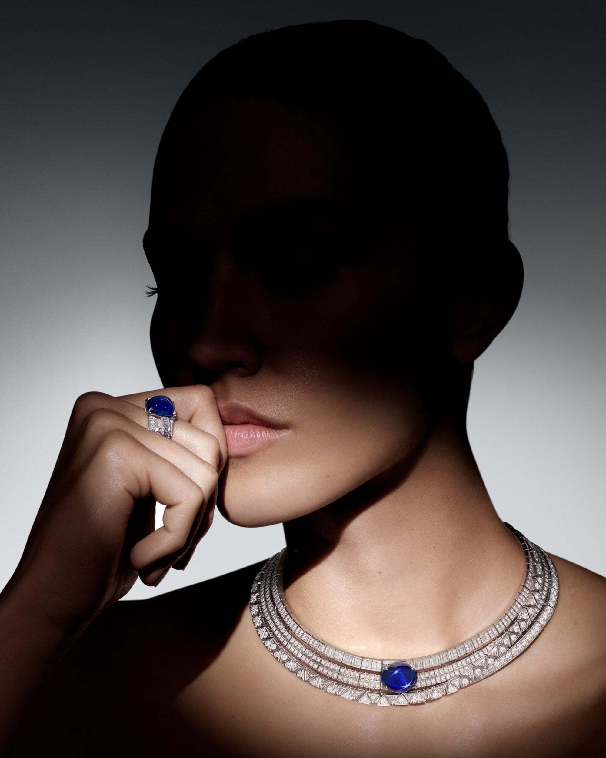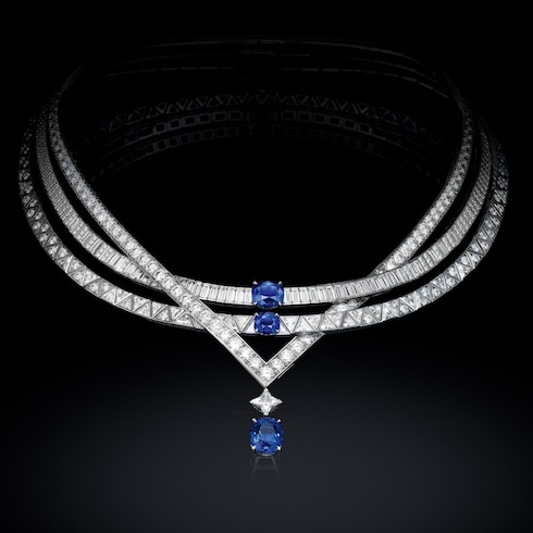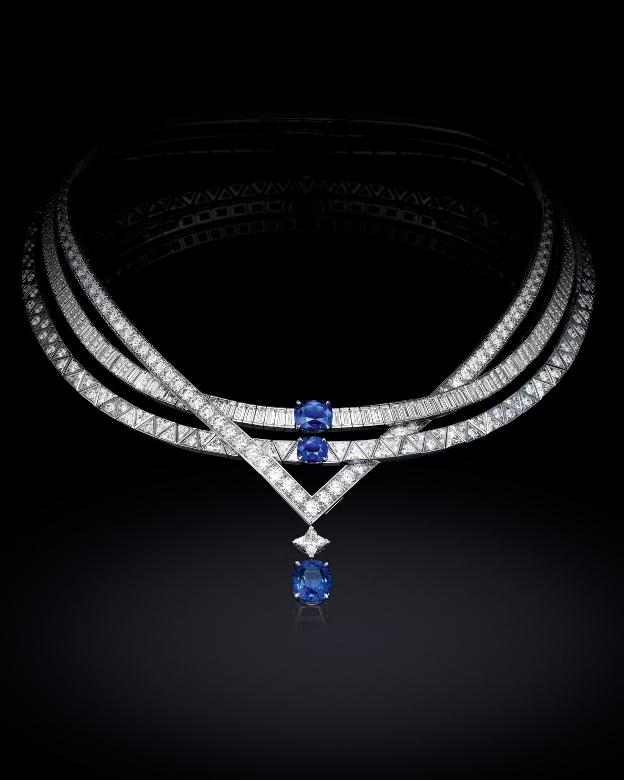 Perception 主題以多顆令人目眩的鑽石交織出重複的幾何圖案,捕捉這個時代的動感和急速的新步伐。前所未見的稀世藍寶石呈現絲絨藍調,成為項鏈的耀眼焦點。