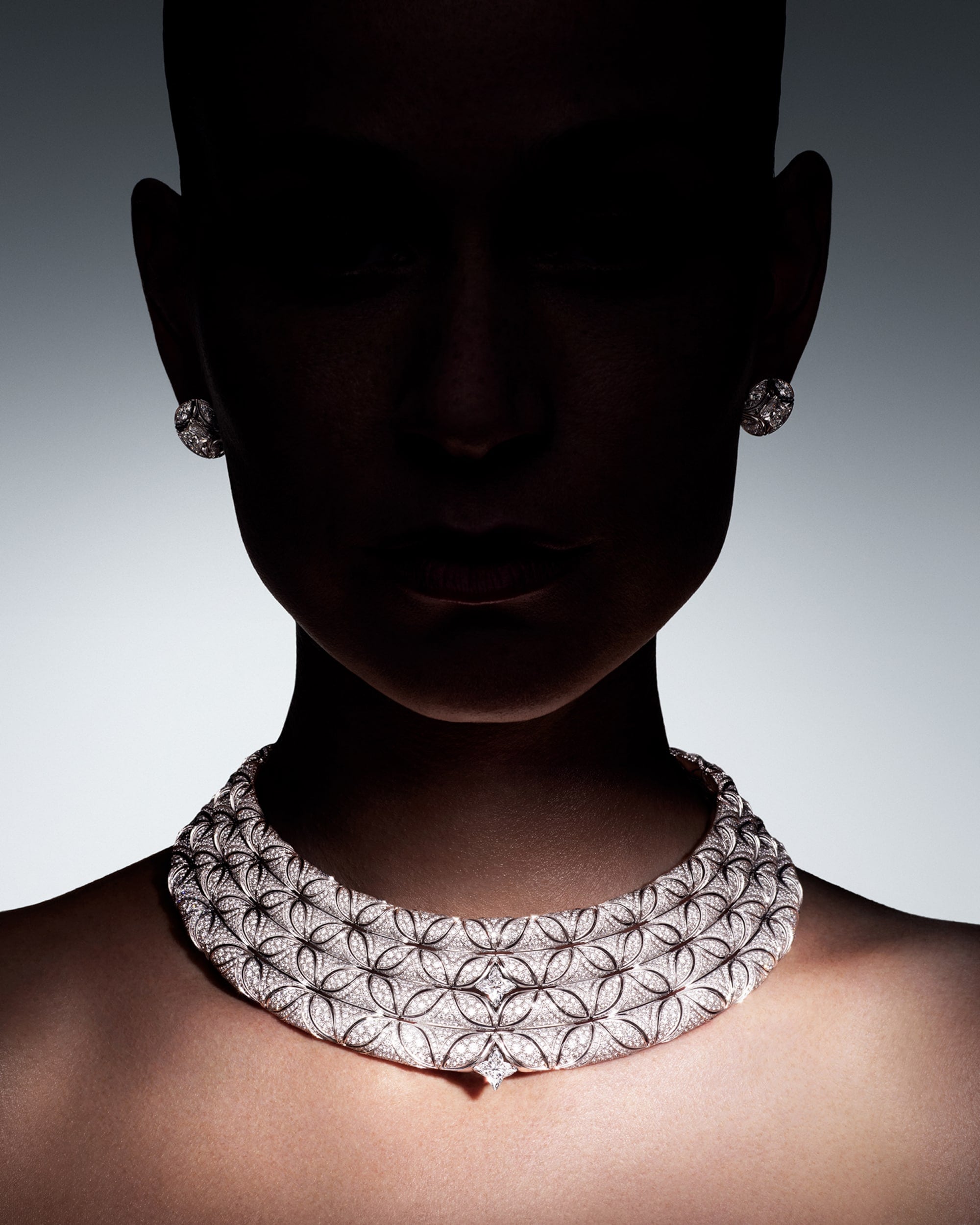 唯美迷人的 Frequence 設計延續現代化和工業化的驚人速度,在四排鑽石項鏈上刻劃重複的標誌性 Kite 圖案。閃亮的美鑽緊密簇擁,細膩演繹經典 Monogram 花卉圖案。