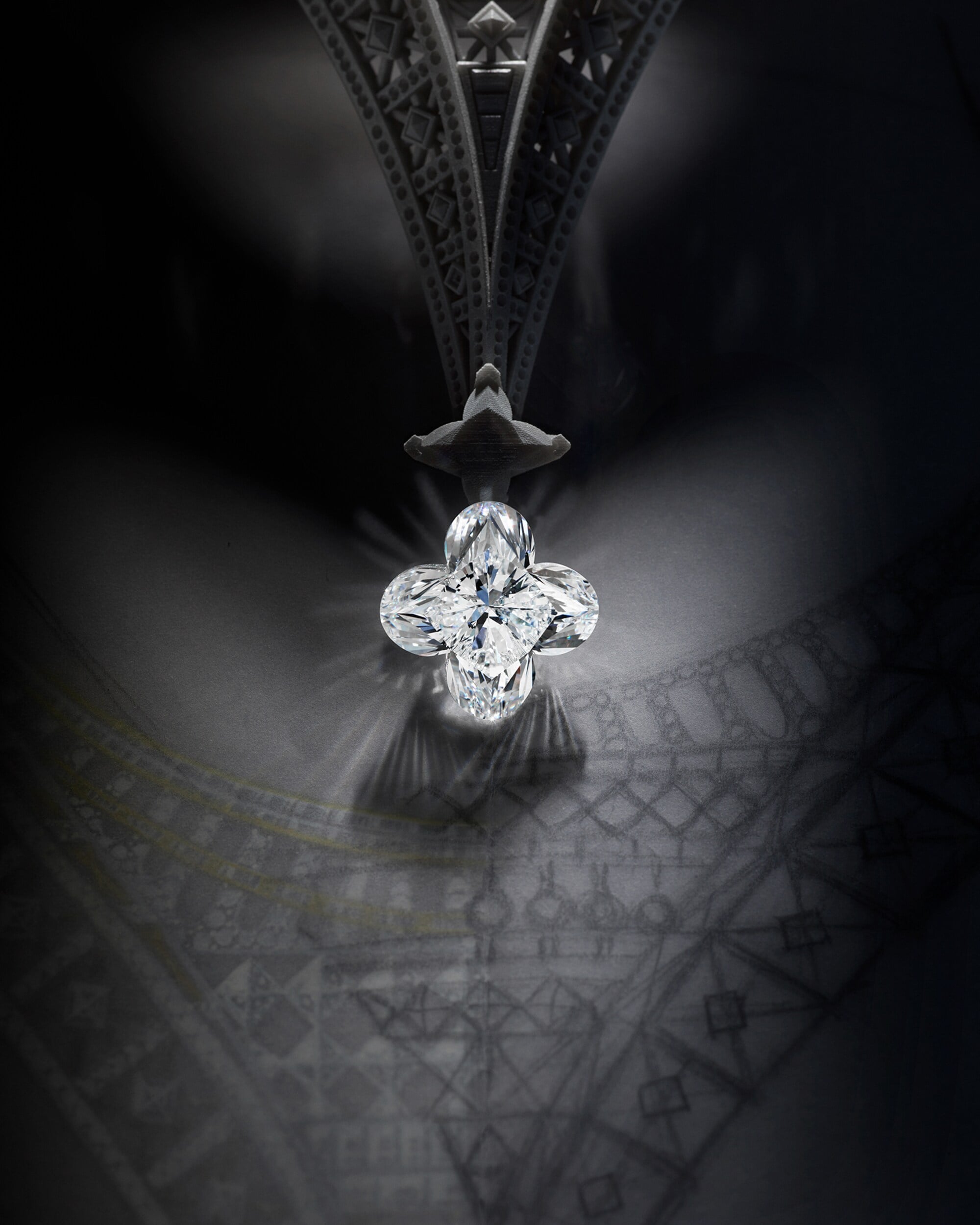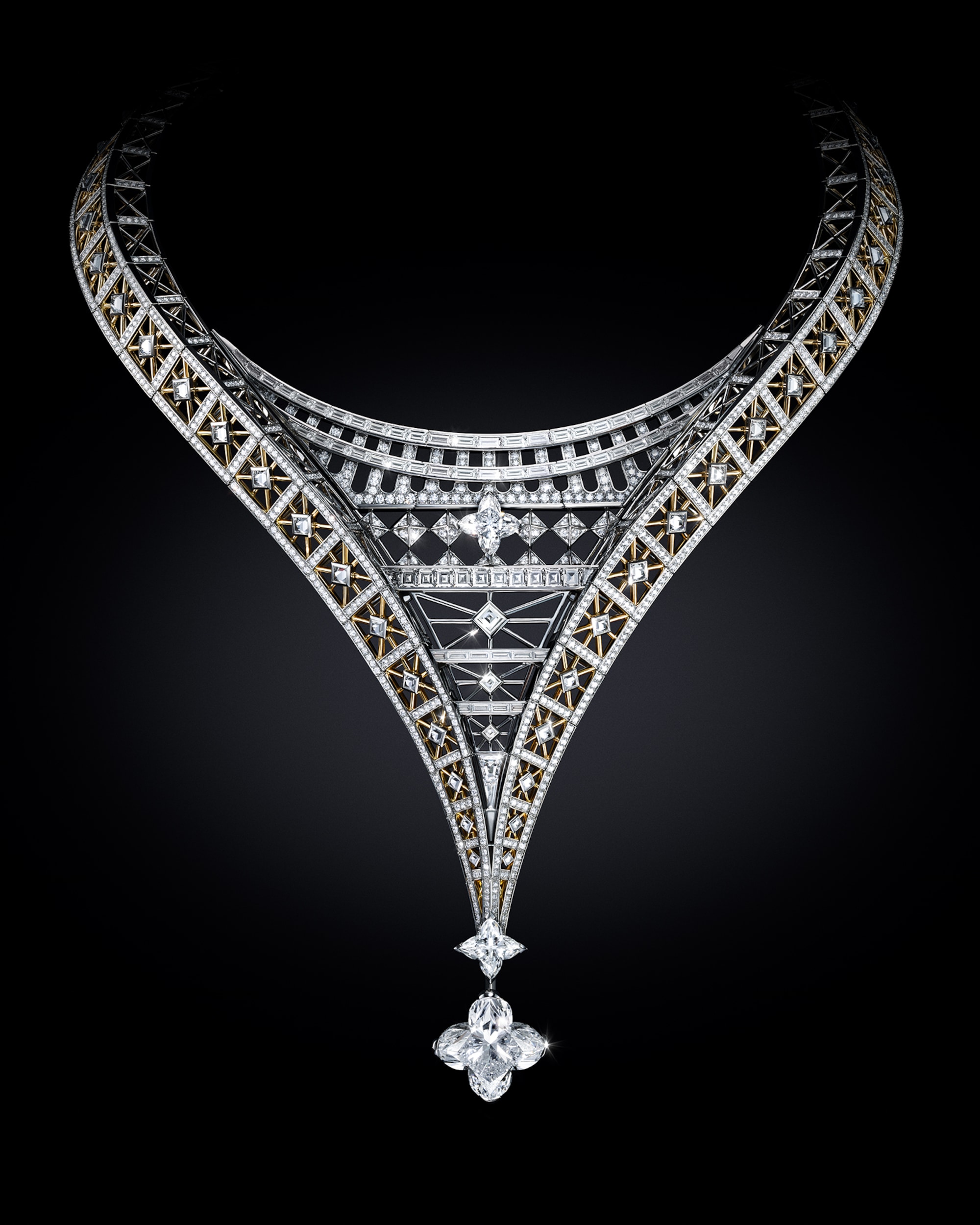Victoire 主題以法國地標艾菲爾鐵塔為題材,令人驚豔的V形項鏈刻劃倒轉的艾菲爾鐵塔,捕捉這座複雜建築的獨特動感。項鏈鑲嵌一顆15.16 克拉D色內無瑕Monogram Flower 切割鑽石,魅力不凡。