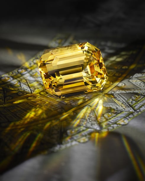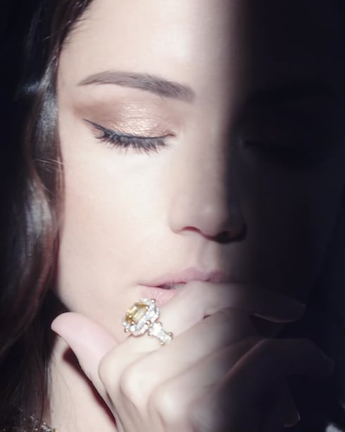 貼服肌膚的珠寶以華美鉚釘重新演繹巧妙交錯的 V 形鏈節,令人想起路易威登的行李箱細節,並以璀璨的金黃色藍寶石點綴。