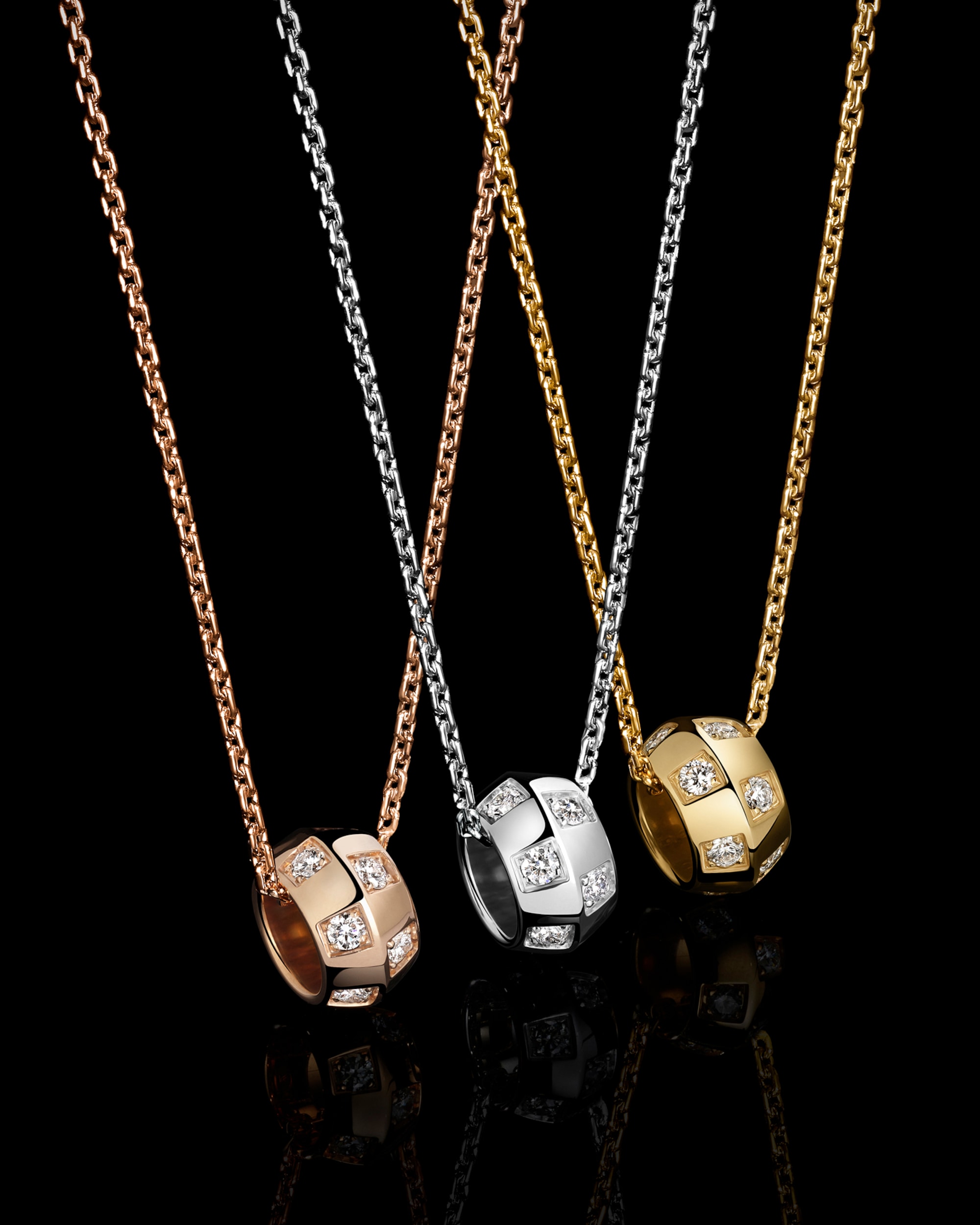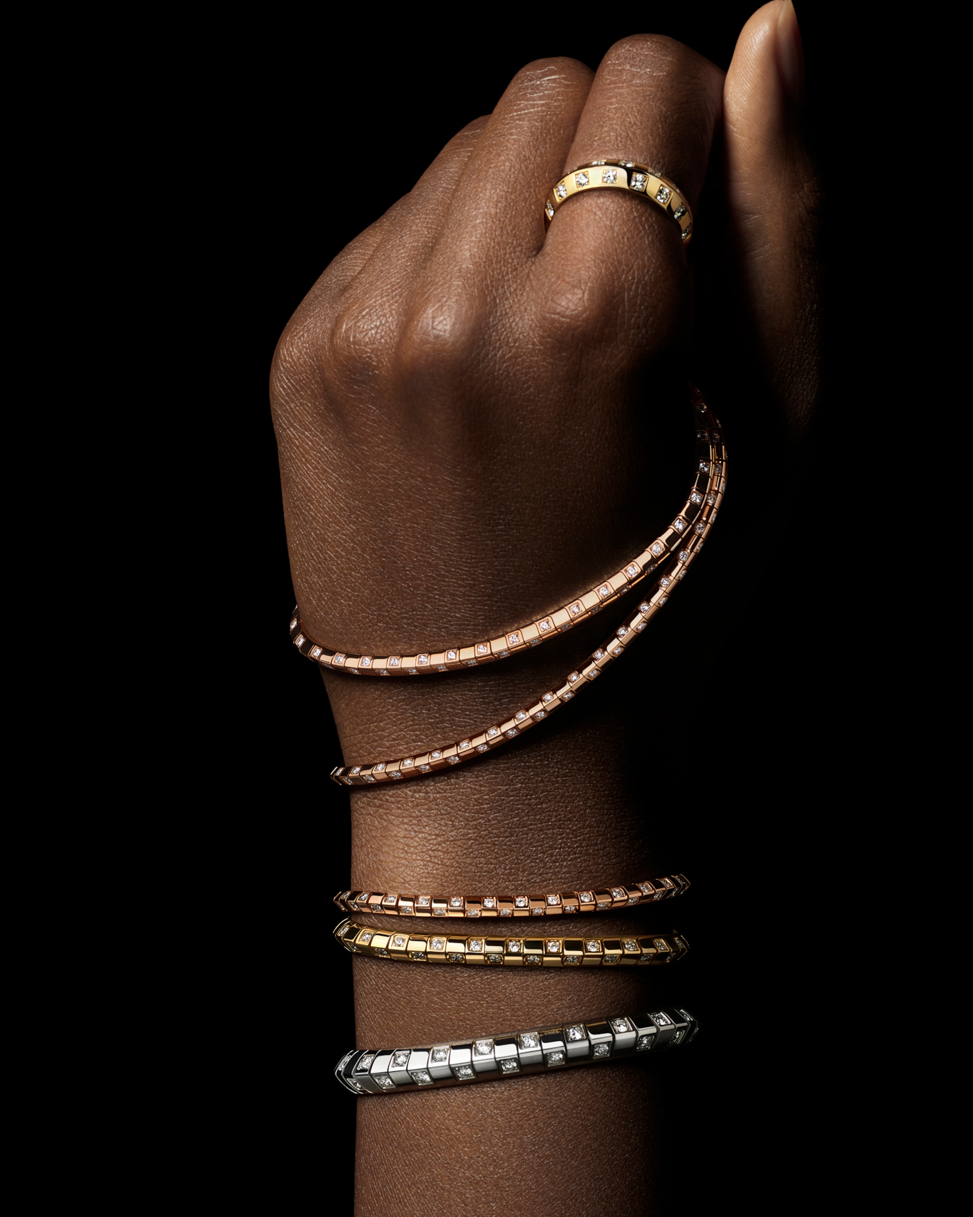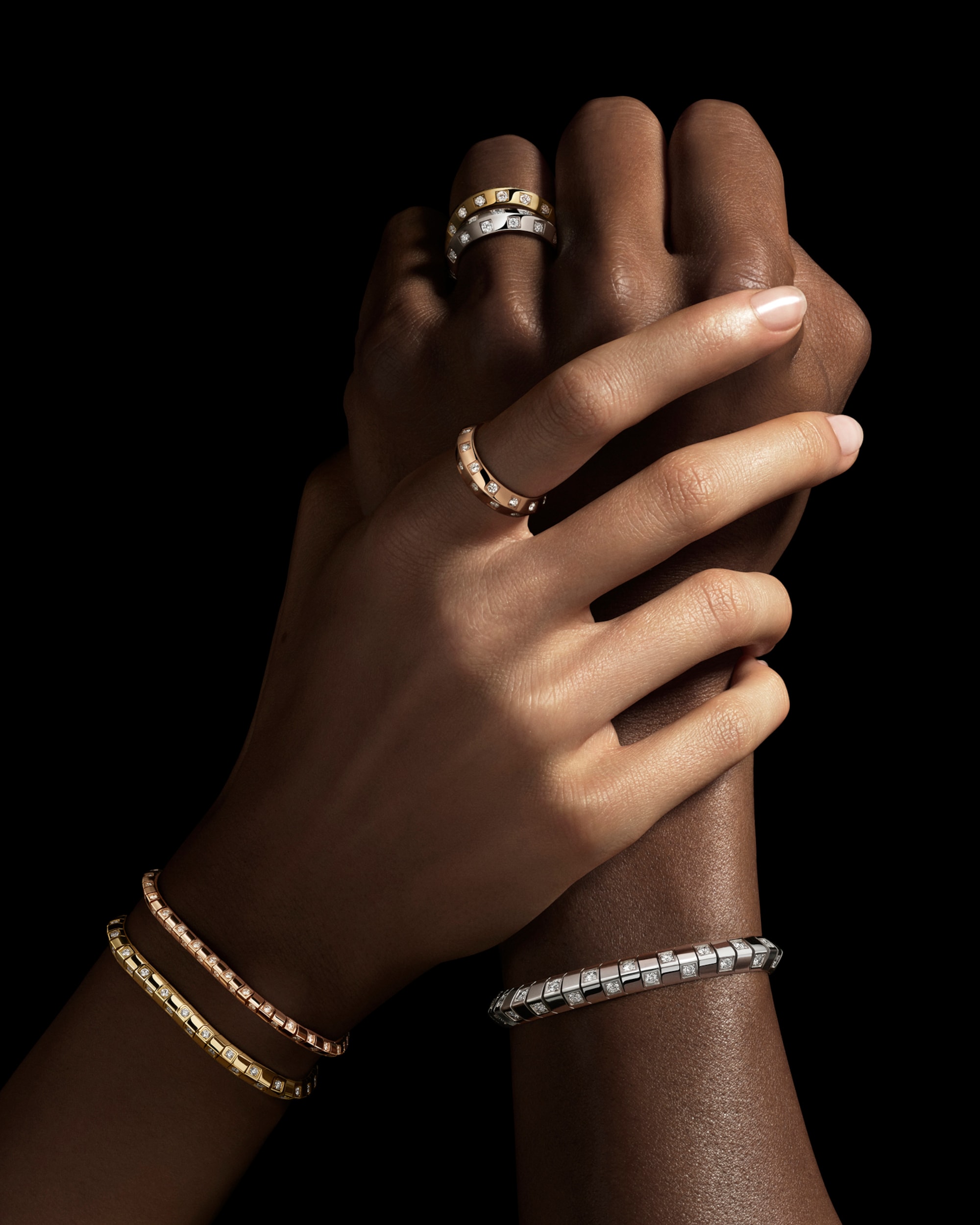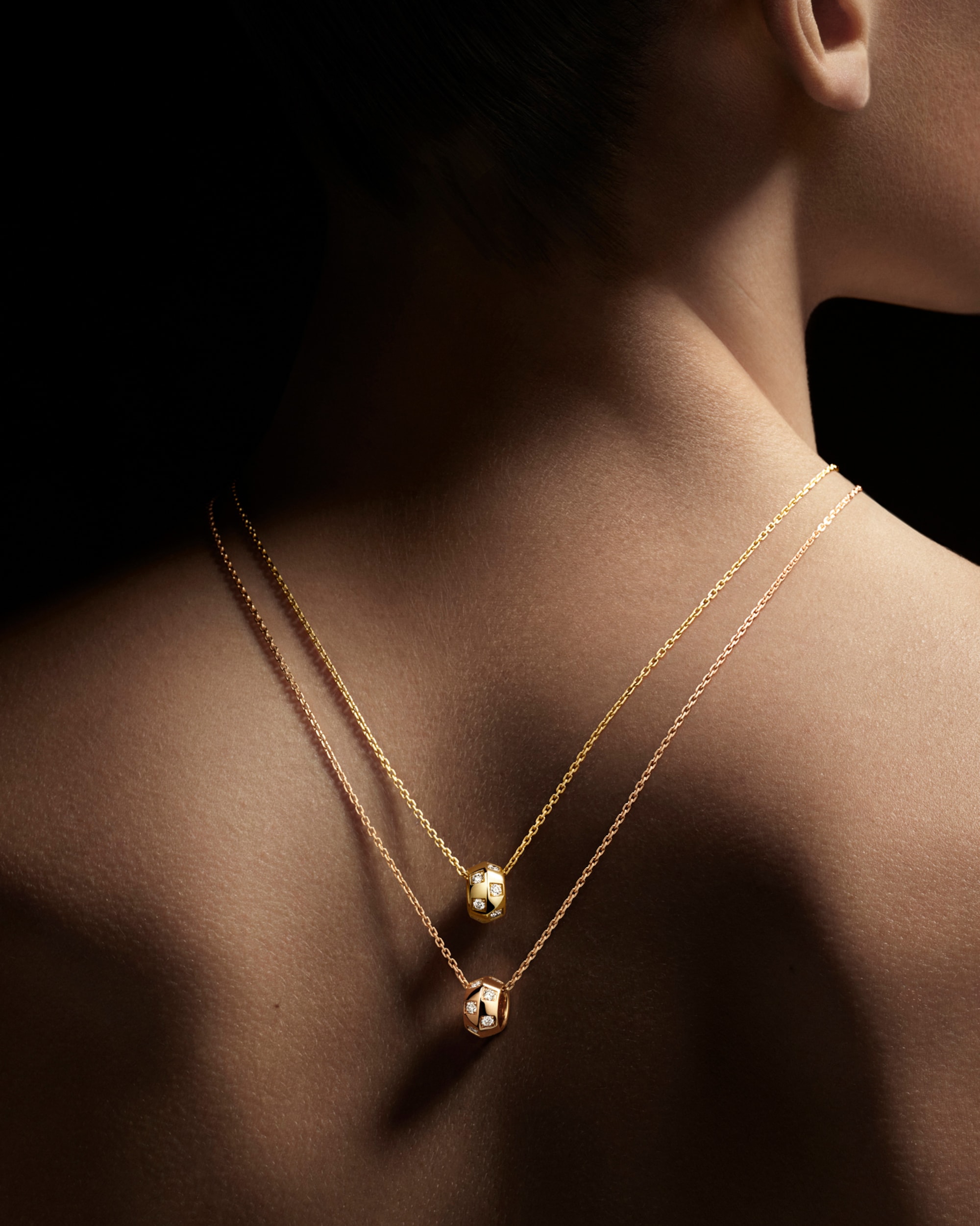 以白金、黃金或玫瑰金雕琢而成的閃爍耳環和吊墜,以幾何鑲嵌設計形成無限重複的懾人效果,並以品牌的經典元素點綴,風格鮮明出眾。