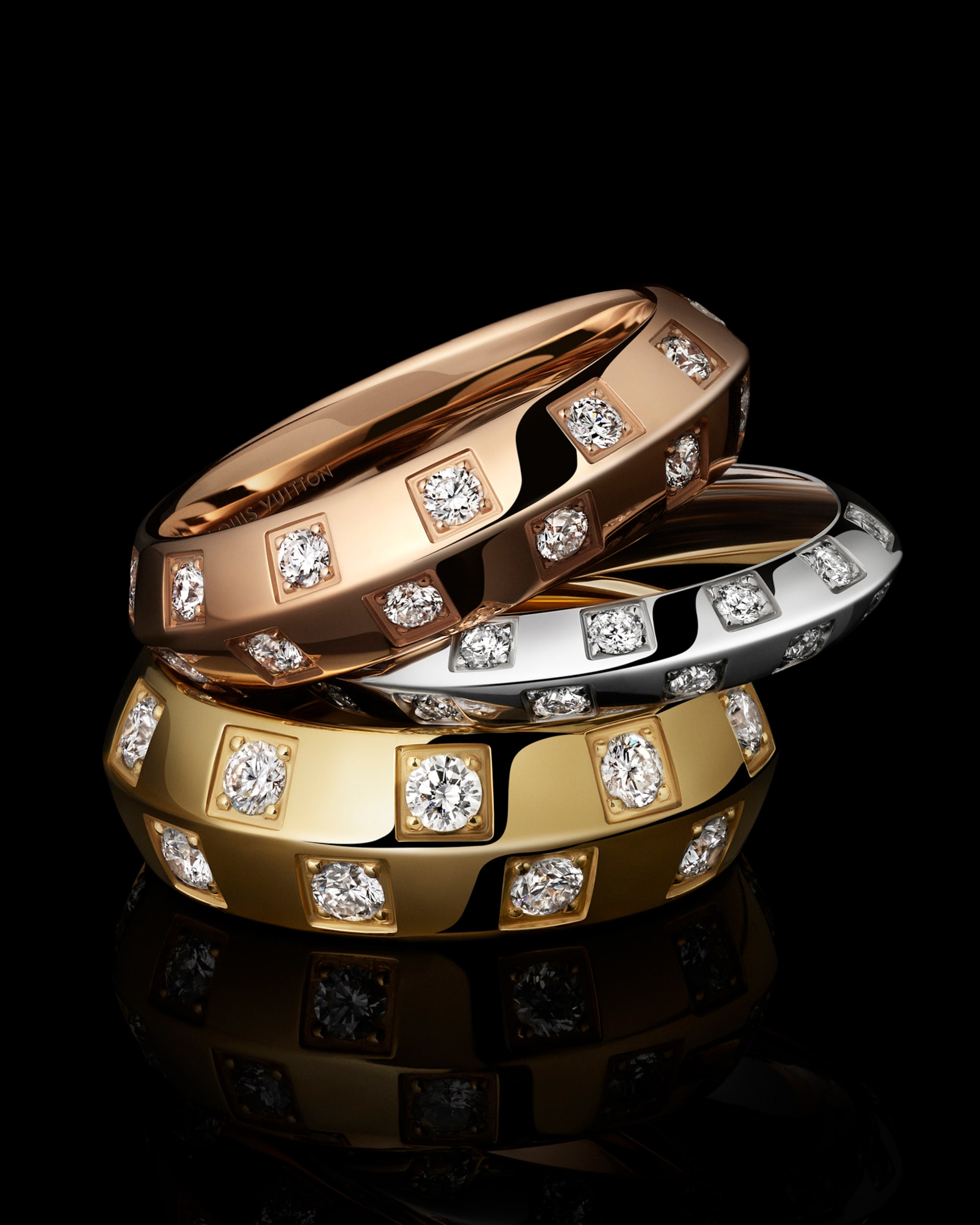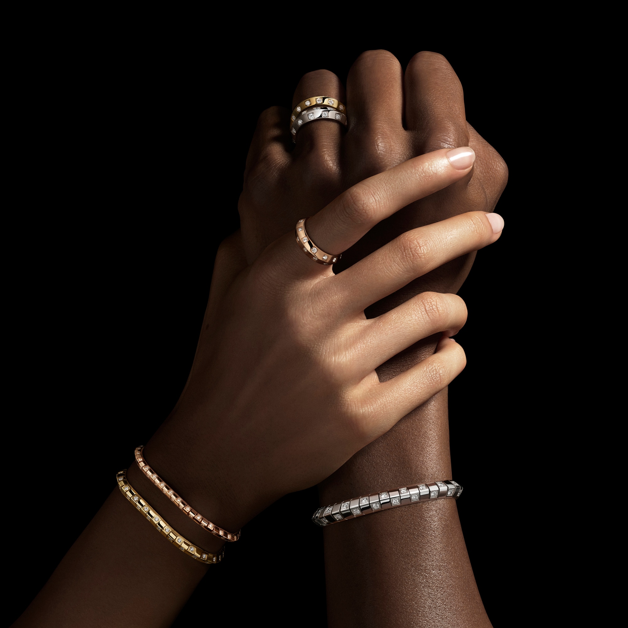 設計以黃金、白金或玫瑰金映襯閃爍美鑽,勾勒出立體優雅的輪廓,並提供三種闊度選擇,方便隨心混搭。