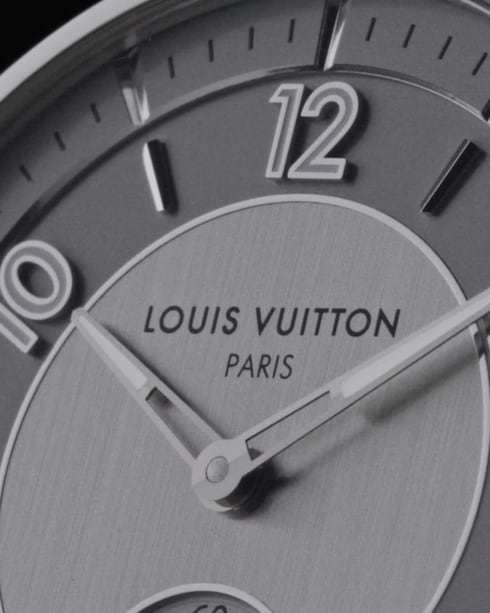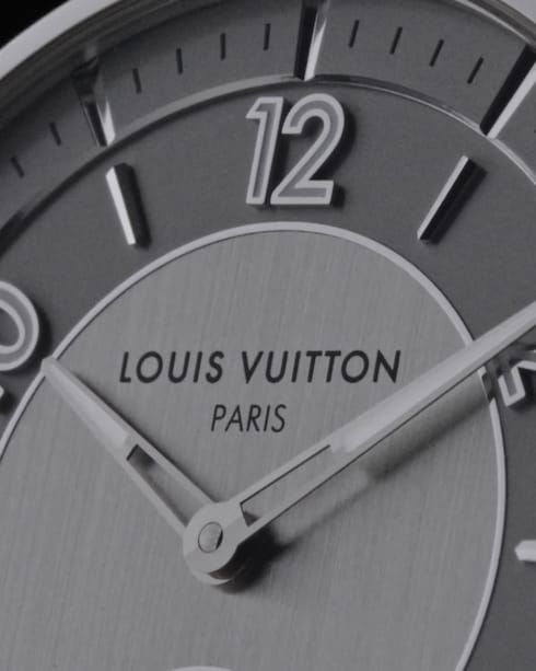 全新 Tambour 腕錶結合瑞士工藝與品牌的傳統法式魅力,錶盤上更添上兩個全新標誌——「Louis Vuitton Paris」和「Fab. en Suisse」。