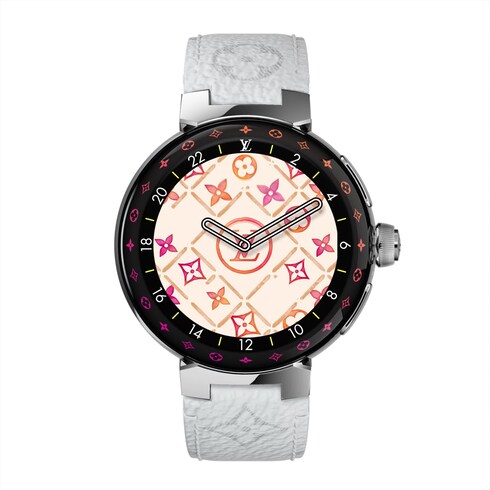Tambour Horizon Light Up 智能腕錶沿用 Tambour 腕錶的經典輪廓與凸面錶殼,貫徹路易威登腕錶的特色元素。腕錶採用匠心設計和雕琢的弧面藍寶石玻璃,營造無邊屏幕的效果。